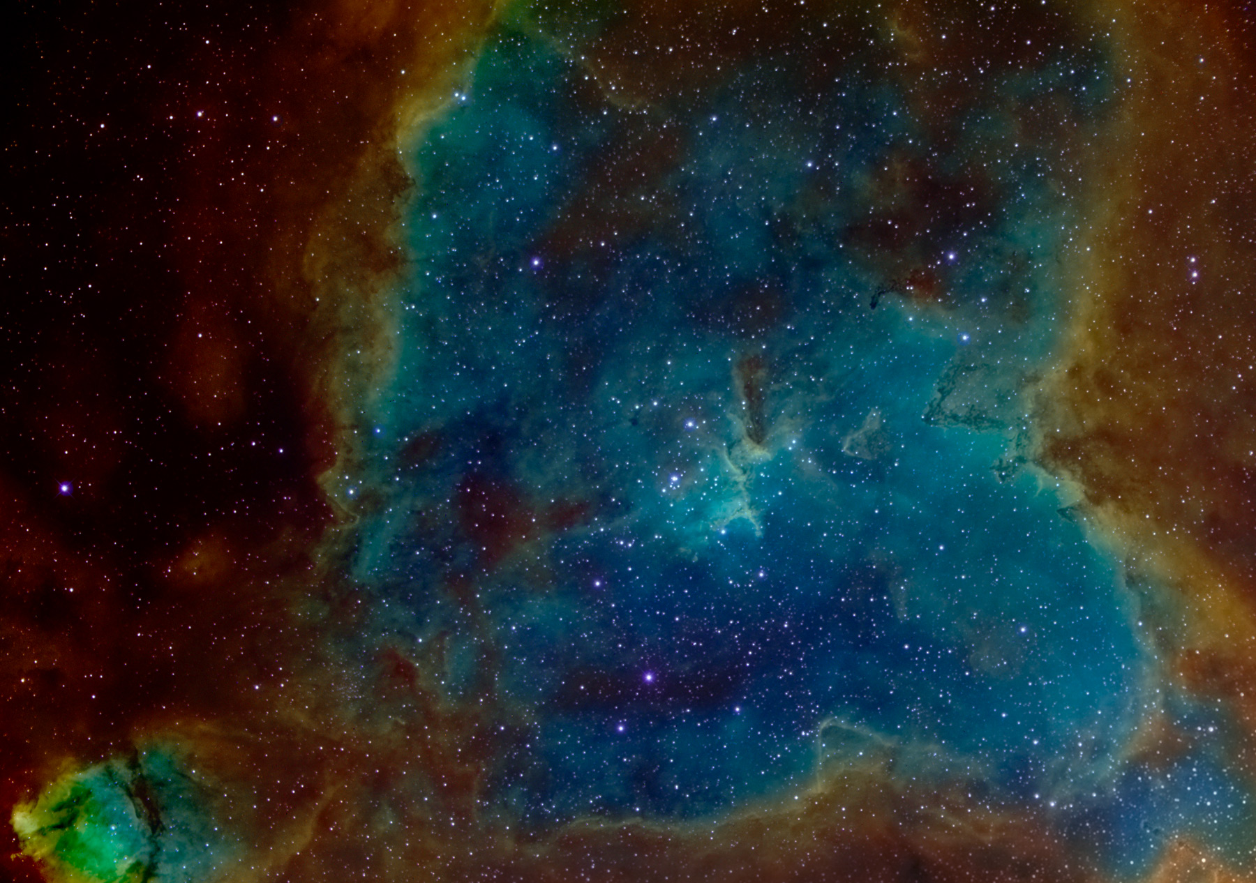 IC 1805 - der Herz-Nebel in Cassiopeia. Dies ist eine SII/H-alpha/OIII-Aufname mit 50, 60 und 60 min Belichtungszeit. ASA 12 Inch, f/3,6-Astrograph, SBIG STL11000 CCD-Kamera auf ASA DDM 85 Montierung. Das Bild wurde im Zentrum von Varna genommen, viel Lichtverschmutzung und Vollmond.