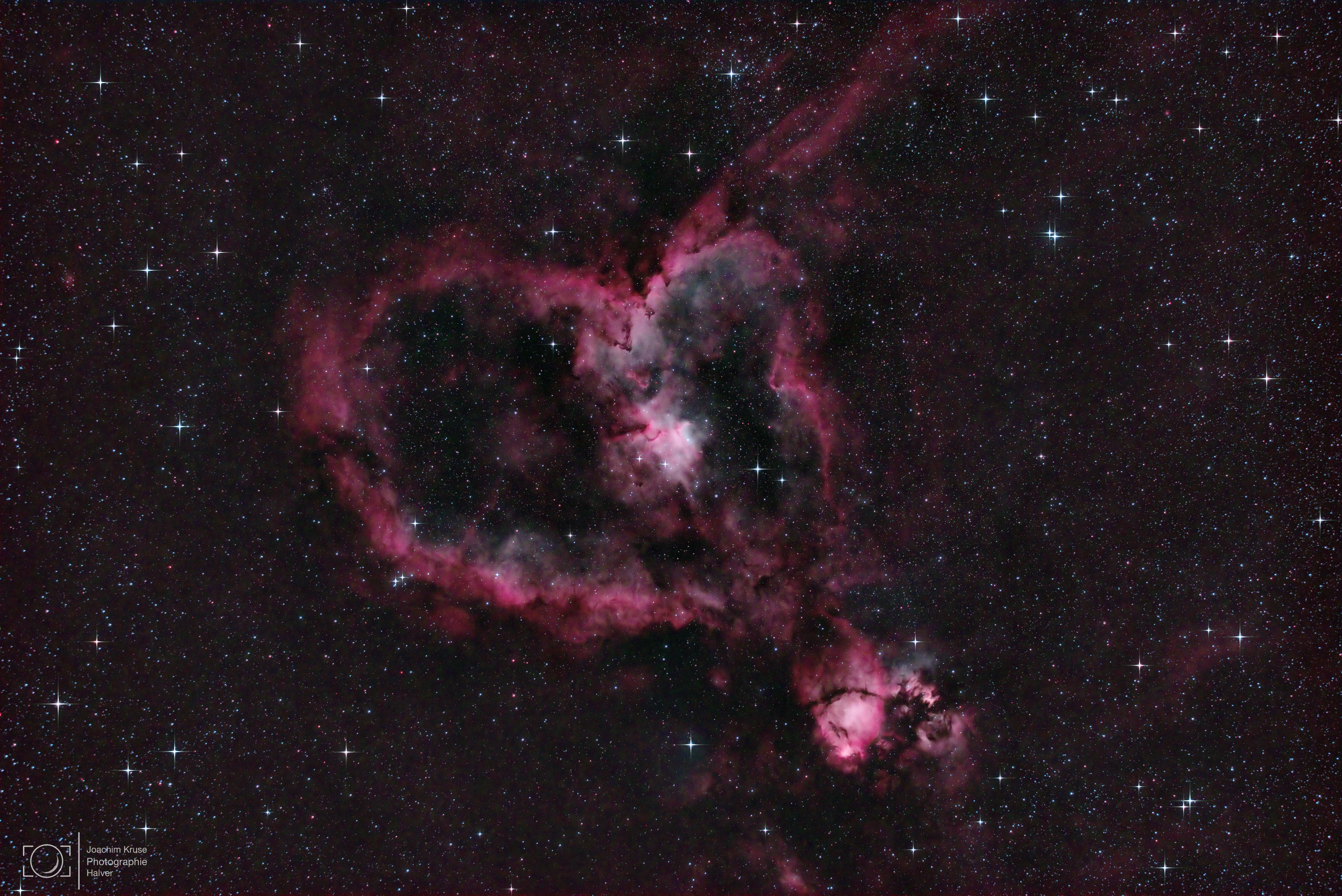 IC 1805 - Das menschliche Herz lässt sich auch am Himmel gut studieren. Der Herznebel im Sternbild Kassiopeia ist ein großer Emissionsnebel mit leuchtendem ionisiertem Wasserstoffgas und dunkleren Staubbahnen. Er ähnelt in seiner Form dem menschlichen Herz. In der Detailansicht sehen wir die rechte und linke »Herzkammer«. Die dazwischenliegende »Herzscheidewand« wird gebildet aus dem Sternhaufen Melotte 15, dessen junge Sterne mit ihren energiereichen Licht die Atome anregen, und mit ihren Winden mehrere malerische Staubsäulen davontragen. NGC 896 - Am südwestlichen Ende des Herznebels befindet sich wie der Punkt eines Ausrufezeichens eine kompakte Emissionswolke mit dem etwas unappetitlichen Namen Fischkopfnebel.