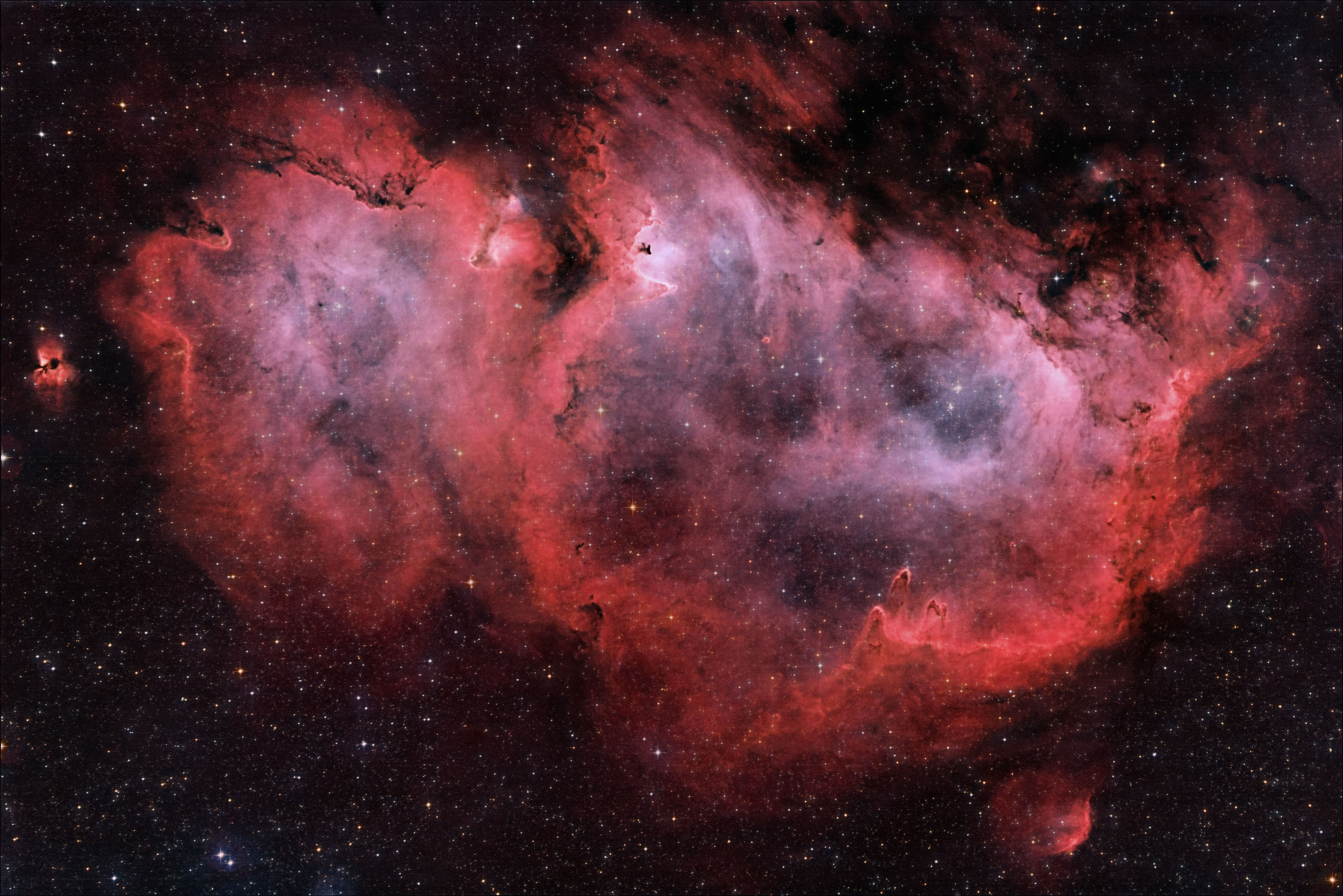 Der Seelennebel im Sternbild Kassiopeia liegt in unmittelbarer Nähe vom Herznebel. Geplant war, in den Vogesen zwei Nächte zu verbringen, um beide Nebel einzufangen. Leider wurden die Bedingungen in der zweiten Nacht sehr schnell schlecht. Somit blieben nur die Aufnahmen der ersten übrig. In Vergleich zum lichtverschmutztem Rhein-Main-Gebiet war ich begeistert vom Ergebnis. Belichtung mit einem 600 mm F3 Newton in RGB 4 h und in H-alpha/OIII 5 h. Standort südlich von Saint-Dié-des-Vosges.
