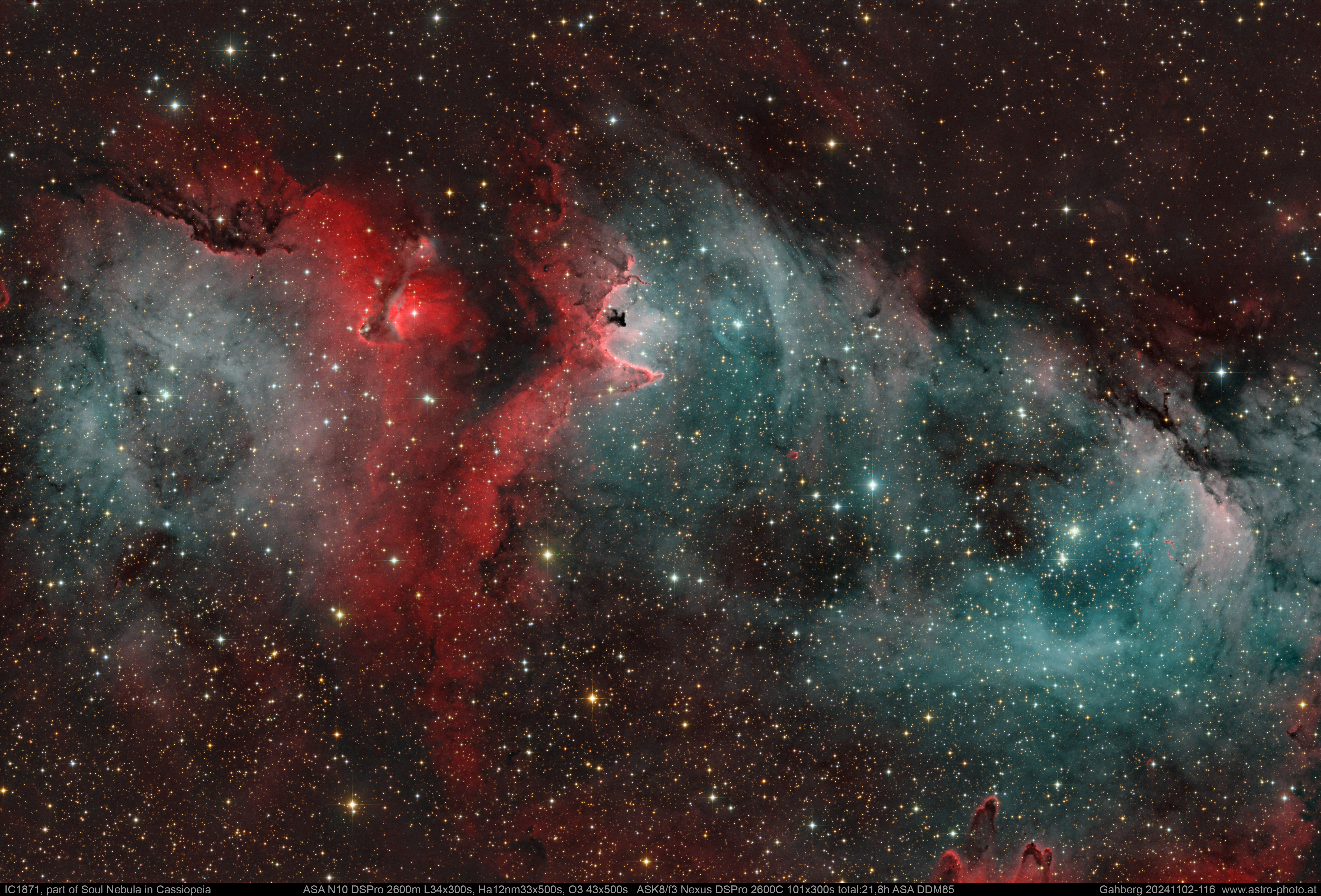 | Belichtungszeit | L 34 x 300s, H-alpha 12nm 33 x 500s, O3 43 x 500s ASK8/f3 Nexus DSPro 2600C 101x300s total:21,8h |