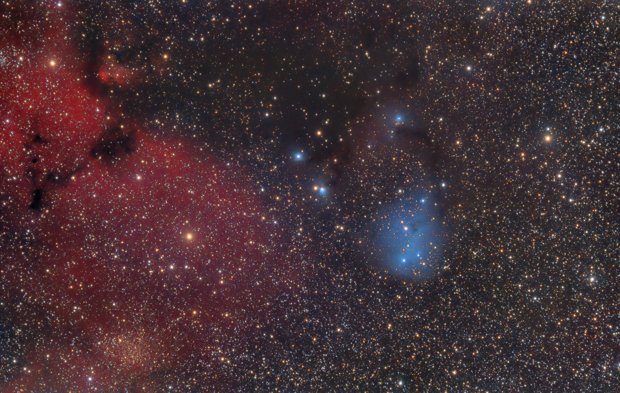 Dieses Bild zeigt einen nicht oft fotografierten Reflexionsnebel-Komplex im Sternbild Monoceros. Auf Grund der Nähe zum populären Christmas Tree Cluster wird er wohl des öfteren nicht beachtet. Der größere blaue Nebel ist mit IC 2169 katalogisiert, die kleineren Nebelflecken haben auch eigene IC-Nummern.
