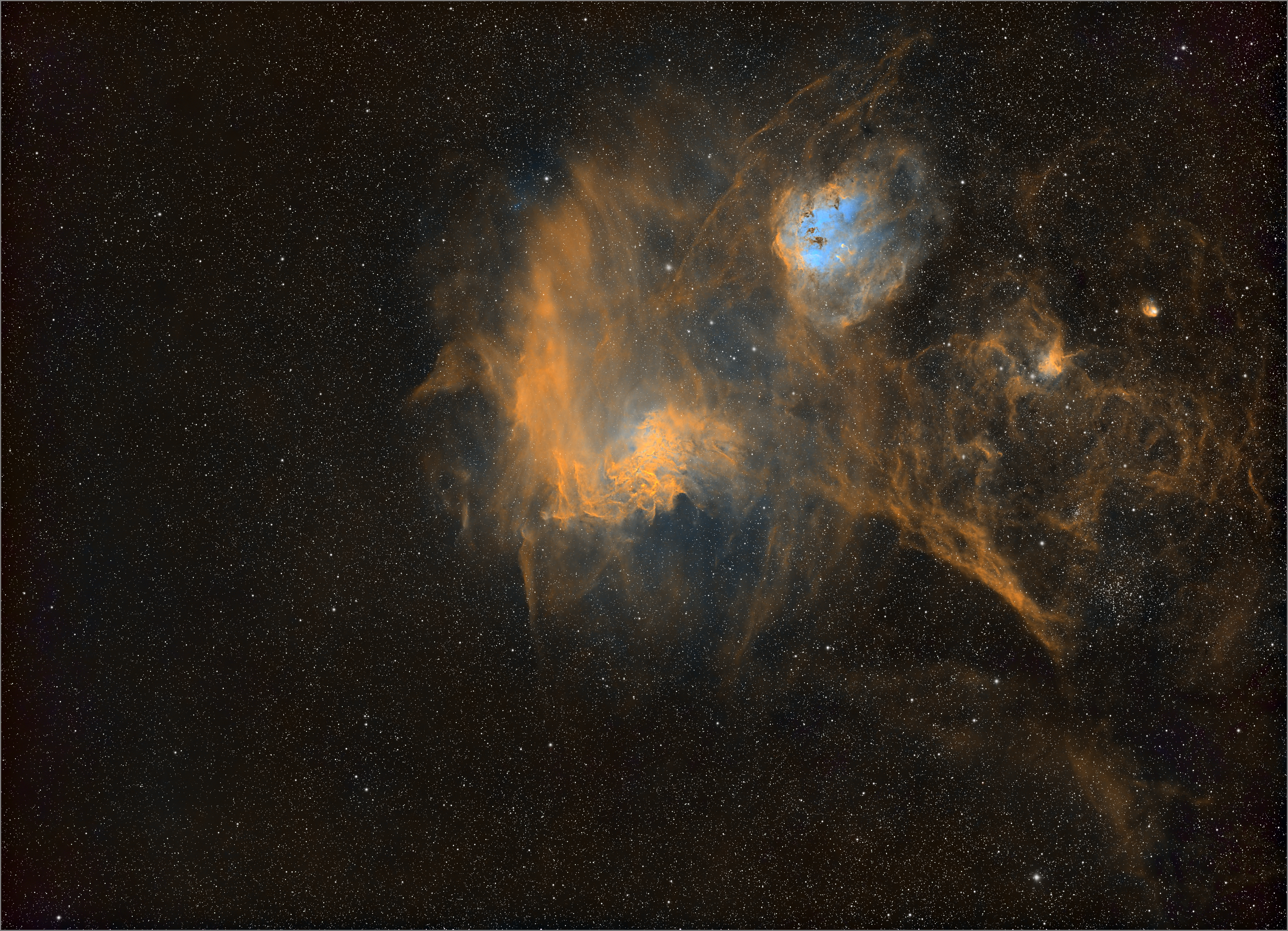 IC 405, auch Flammensternnebel genannt, ist ein diffuser Nebel im Sternbild Fuhrmann am Nordsternhimmel. Er hat eine Winkelausdehnung von 30 × 20 Bogenminuten und eine scheinbare Helligkeit von etwa 10 mag und ist schätzungsweise 1400 Lichtjahre vom Sonnensystem entfernt. ASI1600MM Pro am Samyang 135 mm f/2; 58 x 300 s H-alpha; 30 x 300 s OIII und 42 x 300 s SII bearbeitet als SHO (Hubble Palette)