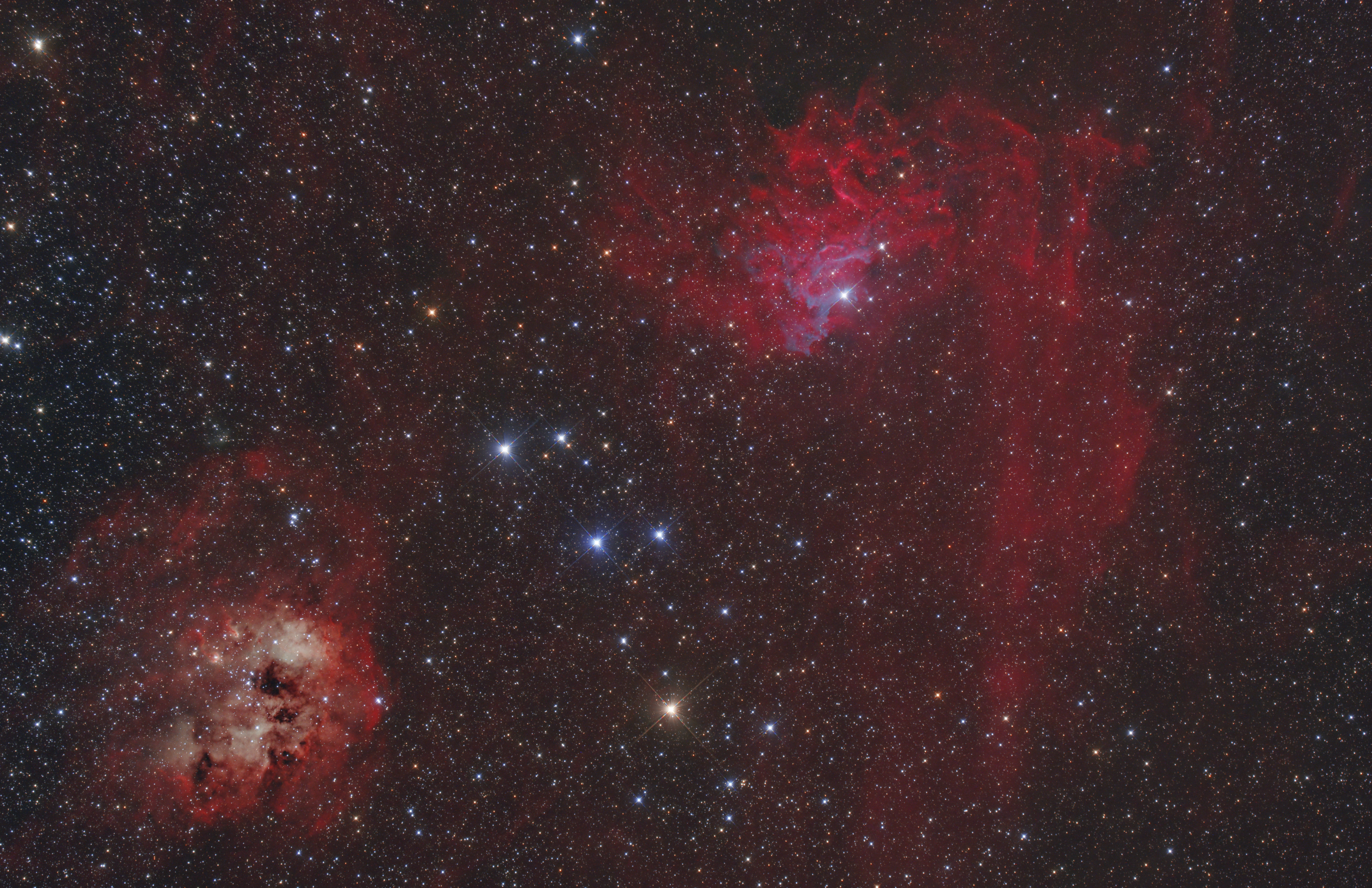 IC 405 (rechts im Bild) wird auch Flammensternnebel genannt und ist ein diffuser Nebel im Sternbild Fuhrmann. Entfernung zirka 1600 Lichtjahre. IC 410 ( links im Bild) ist ein Emissionsnebel mit einem eingebetteten offenen Sternhaufen NGC 1893.