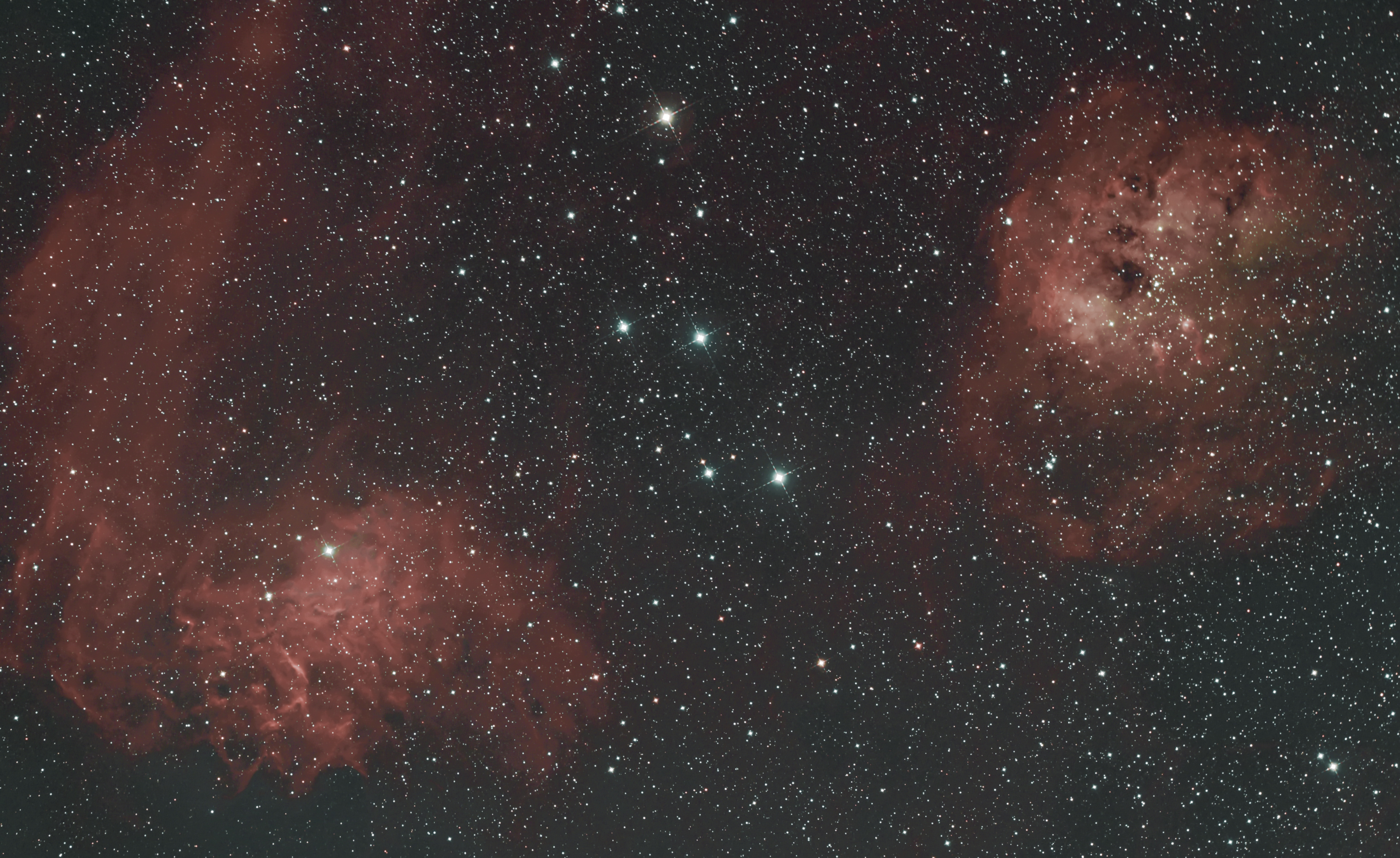 Auf der Aufnahme ist links der Emissionsnebel IC 405 und rechts ist IC 410 mit dem offenen Sternhaufen NGC 1893 im Sternbild Fuhrmann zu sehen.