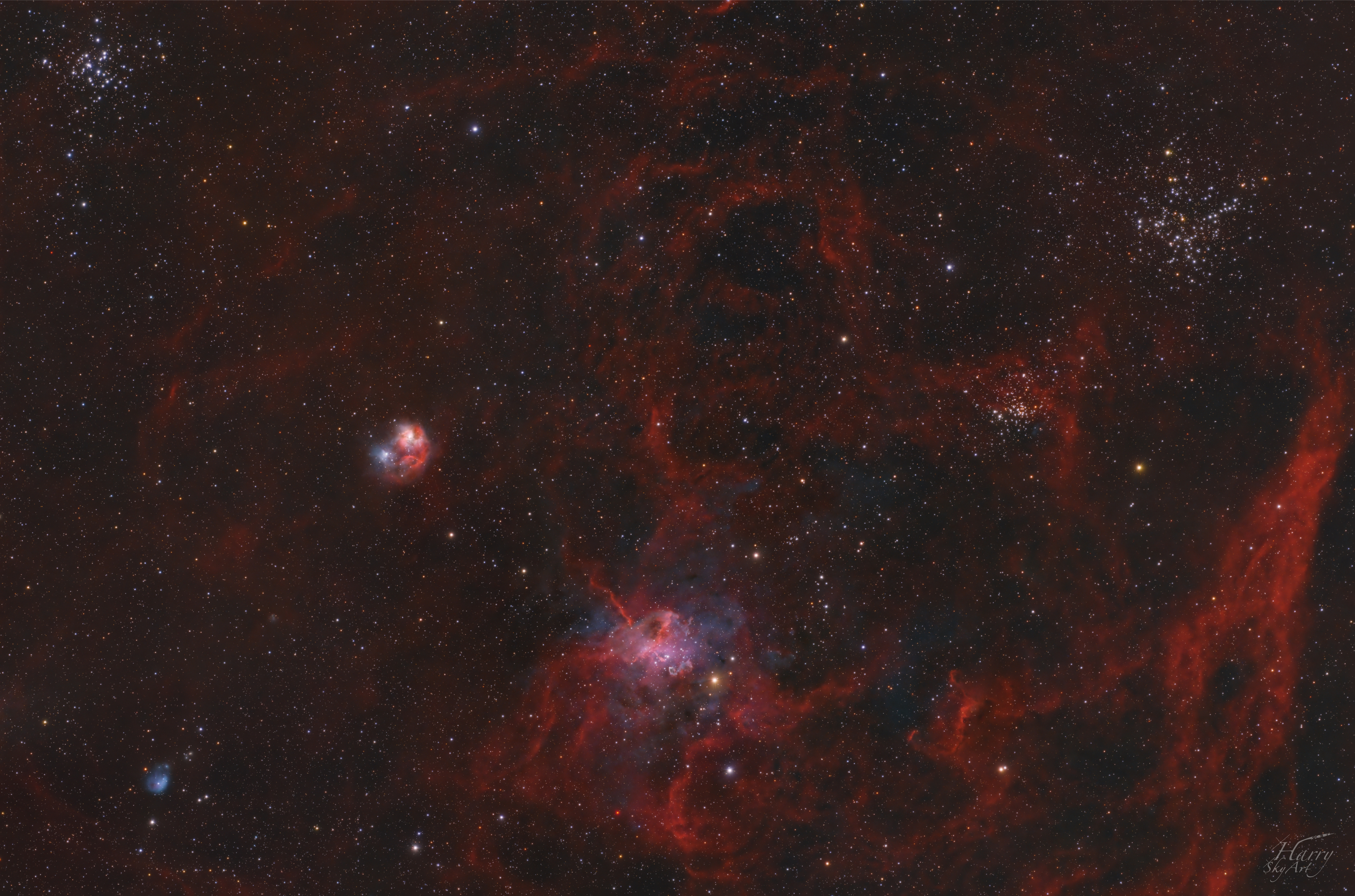 Dieses Mal jagt die Spinne die Sternhaufen und nicht die Fliege. Ich habe diesen Bildausschnitt um IC 417 gewählt, damit die umliegenden Sternhaufen M36/M38 mit auf das Bild passen. Sehr beeindruckt hat mich NGC 1931 bei der Erstellung des Bildes. Es ist immer wieder faszinierend solche geballten Stern Entstehungsgebiete anzuschauen.