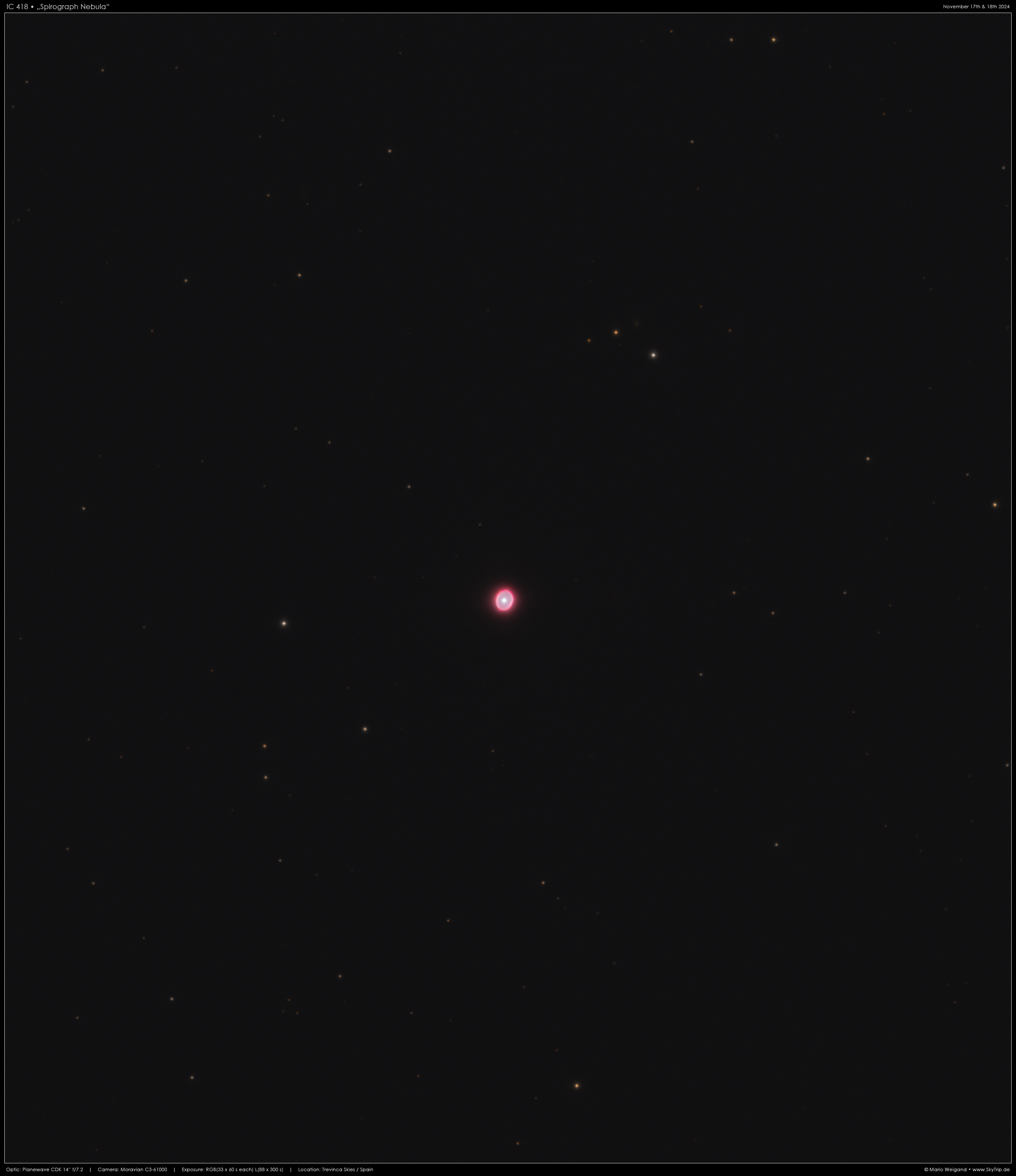 Der so genannte Spirografnebel IC 418 ist ein nur wenige tausend Jahre alter Planetarischer Nebel im Sternbild Hase. Er bildete sich, als der Zentralstern ZZ Leporis das Stadium des Roten Riesen beendete. Der Nebel ist mit nur 13 Bogensekunden Durchmesser ein herausforderndes Fotomotiv. Zumindest weist er darüber hinaus eine hohe Flächenhelligkeit auf, was kurze Belichtungszeiten ermöglicht. Die Aufnahme entstand mit einem Remote-Teleskop in Spanien. Insgesamt wurden 33 Minuten in 60 s Subframes mit der Moravian C3-61000 am Planewave CDK 14 belichtet. ww.skytrip.de