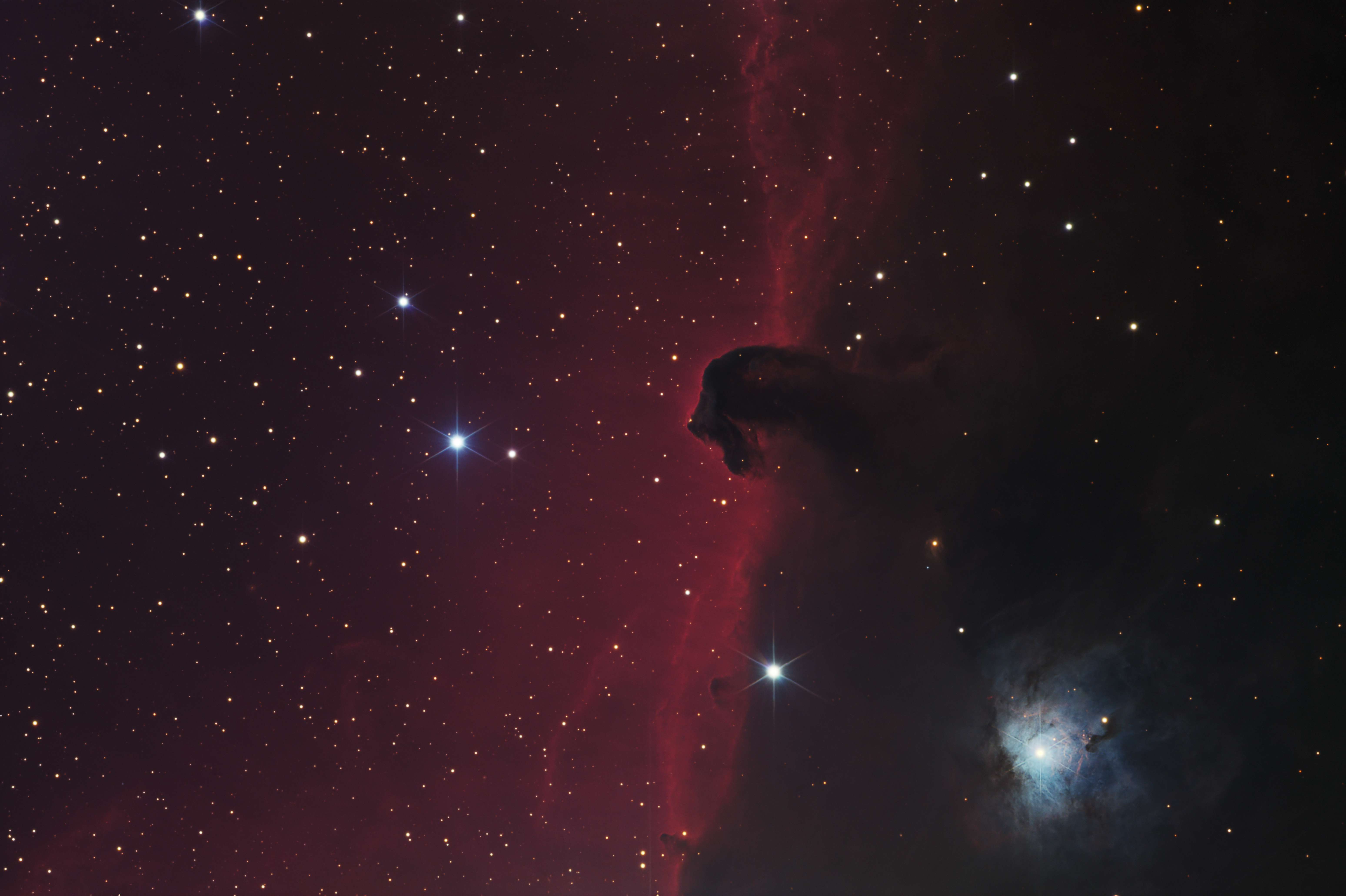 IC 434 ist ein Emissionsnebel im Sternbild Orion, durch den der Pferdekopfnebel, eine Dunkelwolke, hinterleuchtet und so sichtbar wird. Entfernung etwa 1500 Lichtjahre.