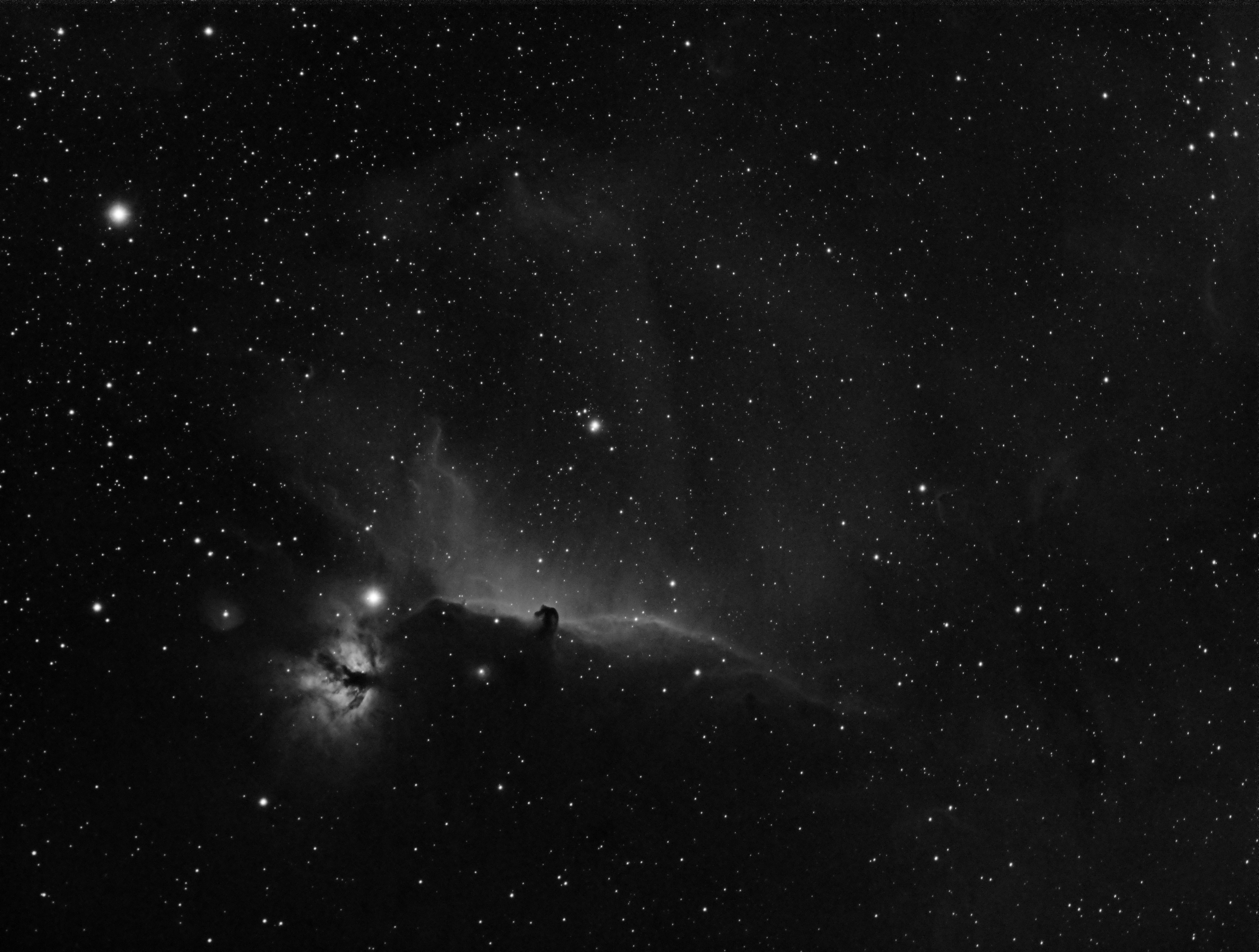Am 2. Weihnachtsfeiertag 2020 ließ ich es mir nicht nehmen, im H-alpha (12 Nanometer Breite) den Pferdekopf bei 270 Millimeter Brennweite aufzunehmen. Die Ausbeute war durch Nebel und Wolken 10/60 Bilder. Doch diese 10 sind ganz brauchbar!