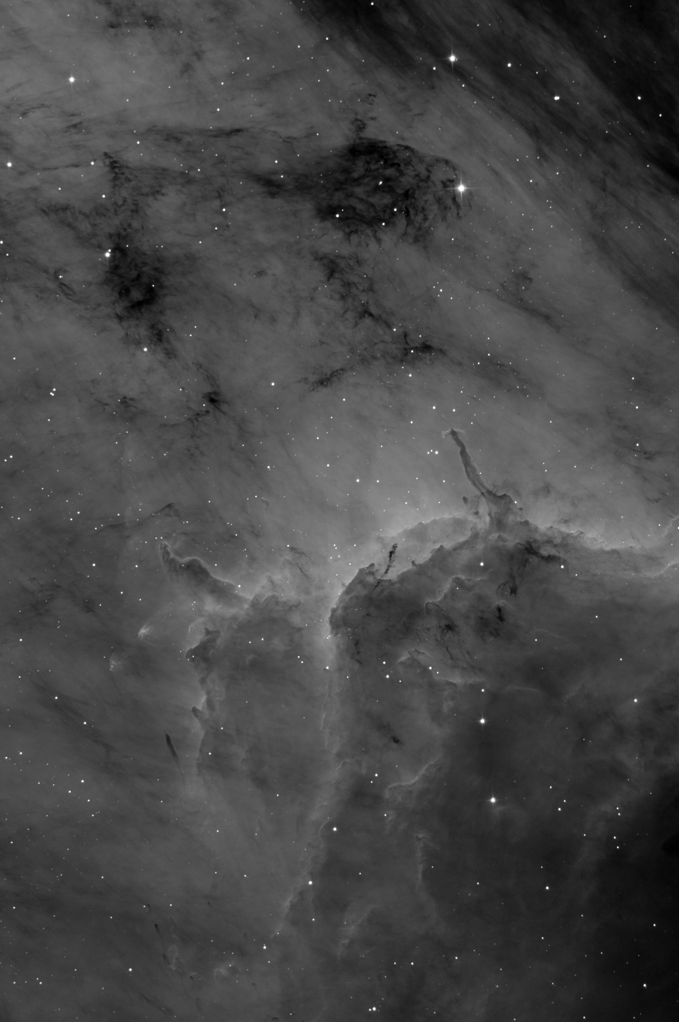 Dieses Bild zeigt einen Teilausschnitt des Pelikannebels. Das Wechselspiel aus Dunkelwolken und den Schattierungen des Nebels gefiel mit sehr gut. Wenn man das Bild eine Zeit ansieht, könnte man geneigt sein einen Schwimmer im hohen Wellengang zu erkennen - mit etwas Phantasie.
