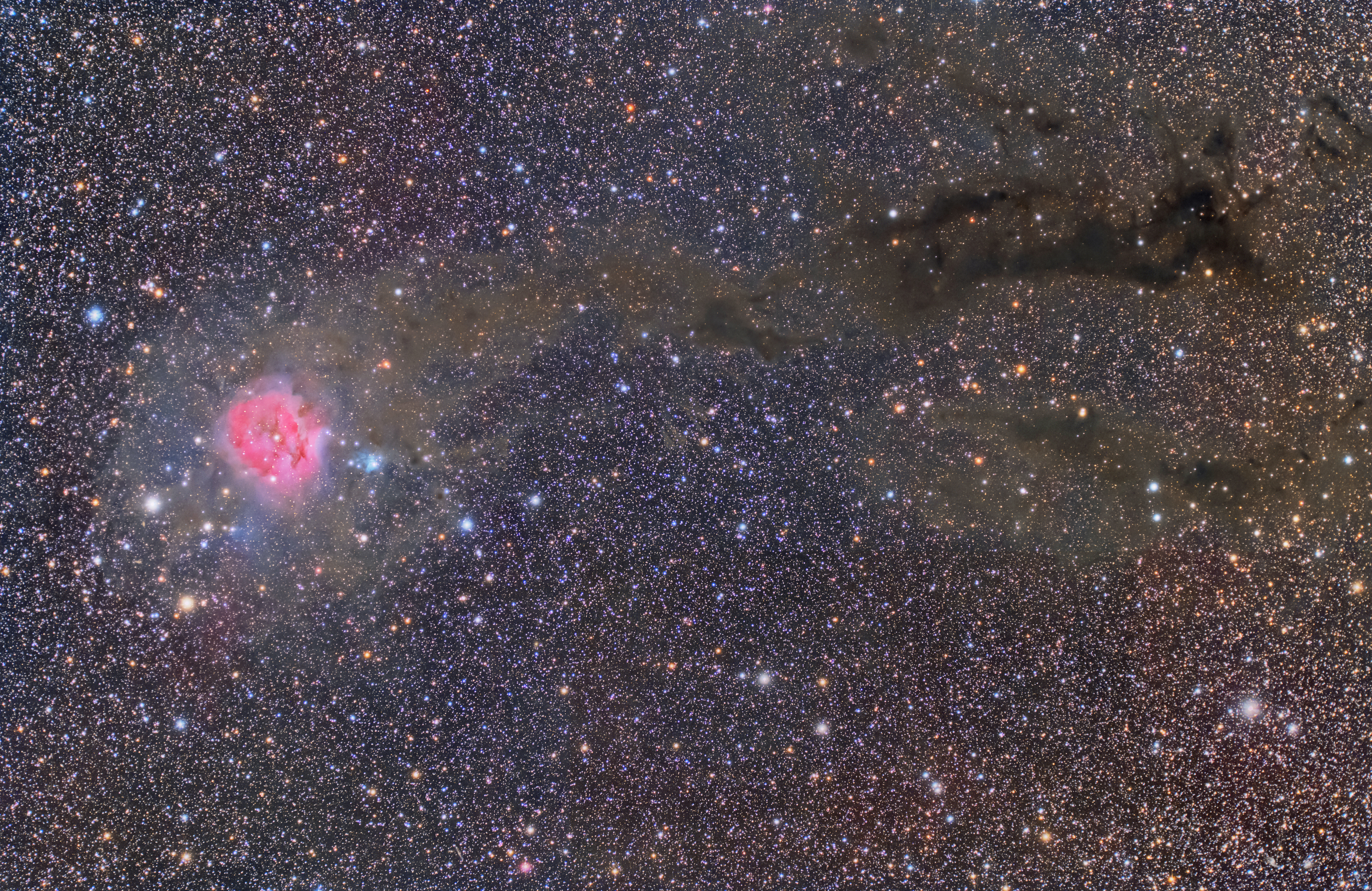 Wie in Watte eingehüllt erscheint der Kokonnebel im Schwan an der Grenze zum Sternbild Eidechse. Es sieht so aus, als ob er eine Dunkelwolke hinter sich herzieht. Am dunkelsten Bereich dieser Wolke lässt sich mit dem Fernglas sehr gut die Himmelsqualität beurteilen.