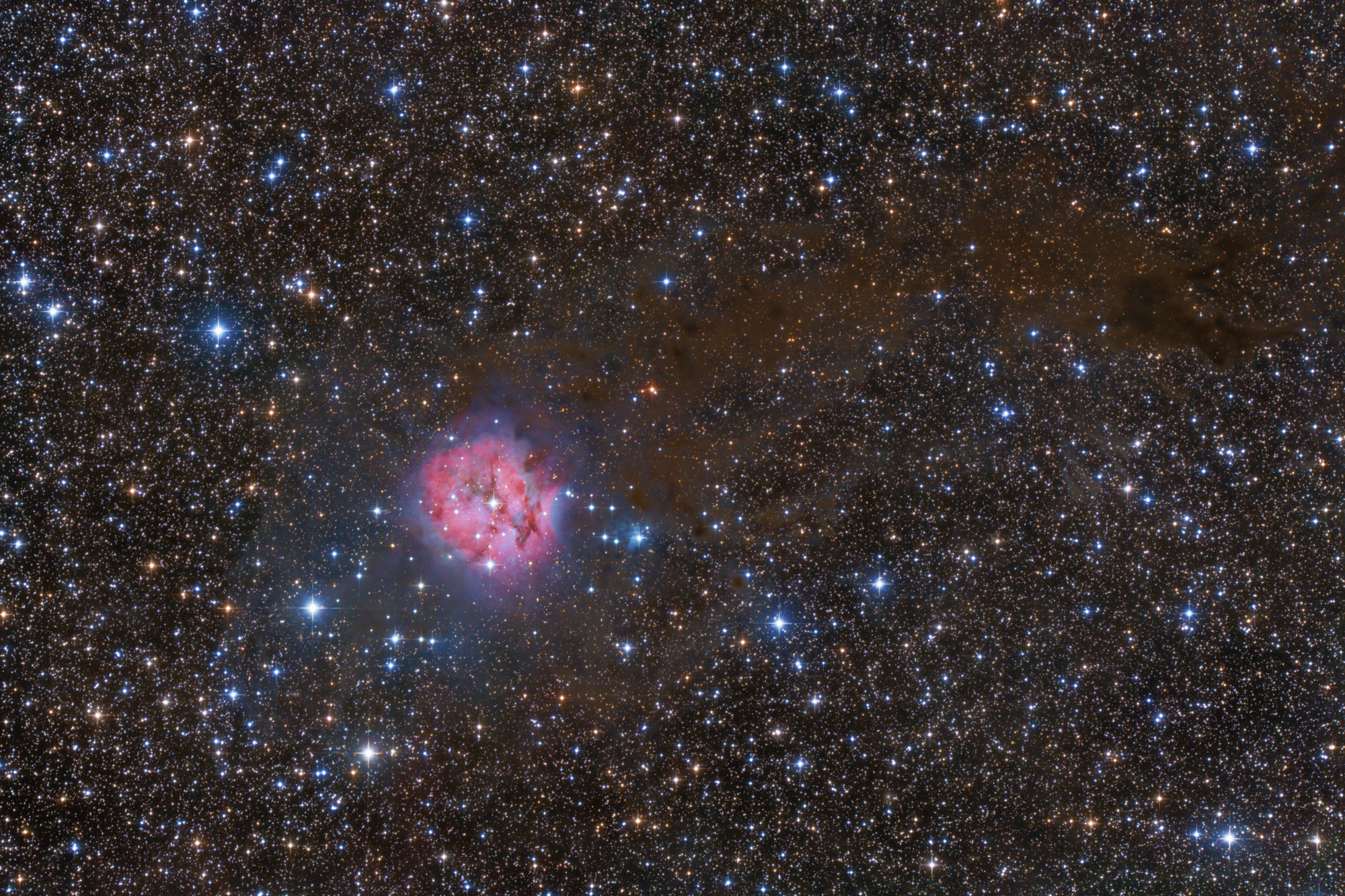 IC 5146 ist ein Emissionsnebel mit einem eingebetteten Sternhaufen und die Umgebung wird von Dunkelwolken begleitet.