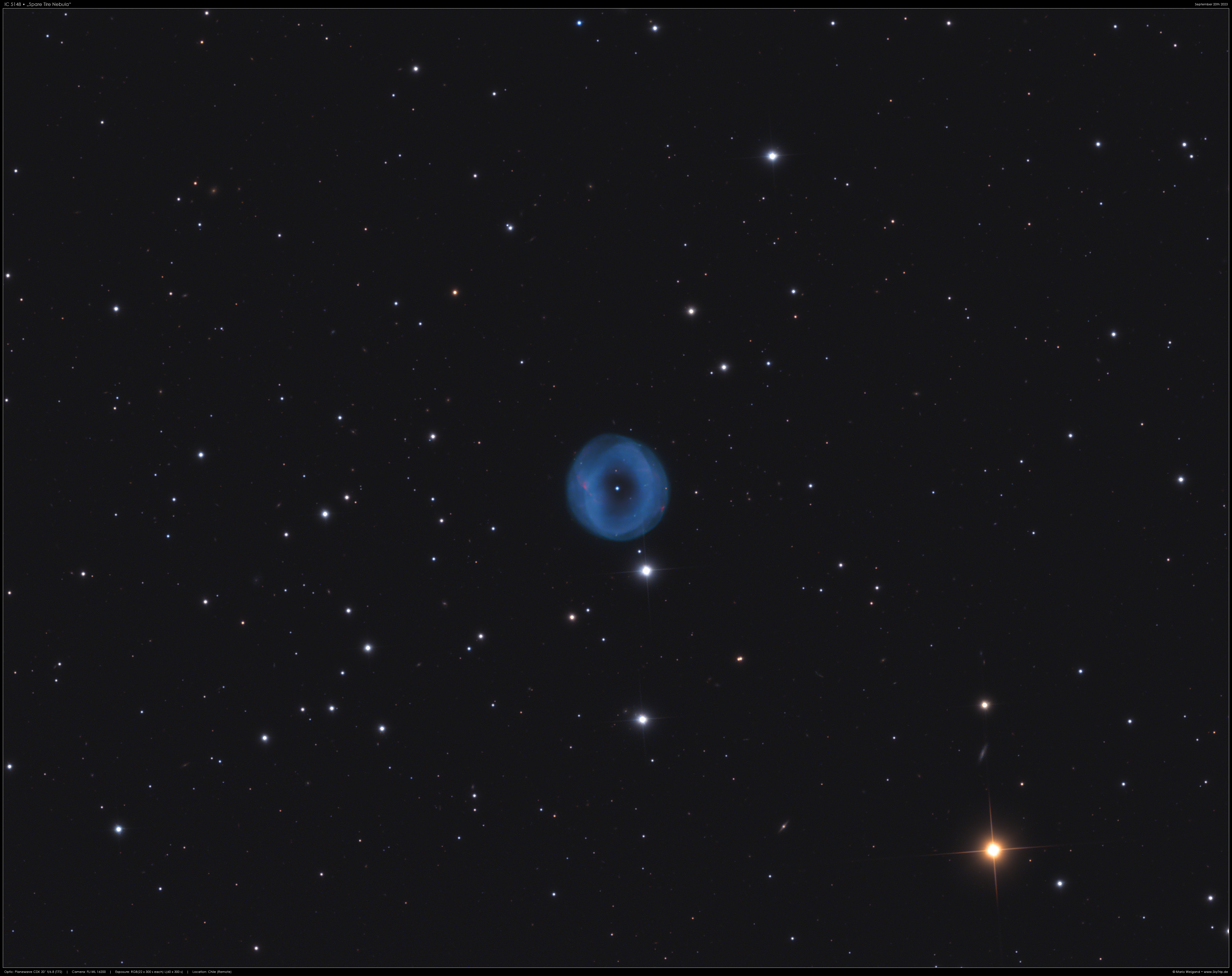 IC 5148 (= IC 5150) ist ein Planetarischer Nebel am Südhimmel im Sternbild Kranich (Grus). Er befindet sich in einer Entfernung von rund 2900 Lichtjahren von uns. Die Aufnahme entstand mit einem Remote-Teleskop in Chile (iTelescope T72). Insgesamt wurde 10,5 Stunden belichtet. http:/www.skytrip.de