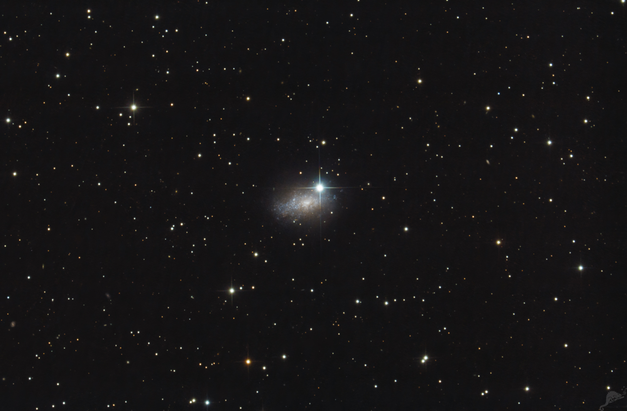 Am Rande der Lokalen Gruppe, quasi an unserer intergalaktischen Grundstücksgrenze, befindet sich die helle irreguläre Zwerggalaxie IC 5152. In unserer Aufnahme sind zahlreiche helle Einzelsterne, Sternentstehungsgebiete und Staubwolken der Galaxie zu erkennen. Zusammen mit dem hellen Vordergrundstern HD 209142 bildet sie ein wunderschönes kosmisches Pärchen.