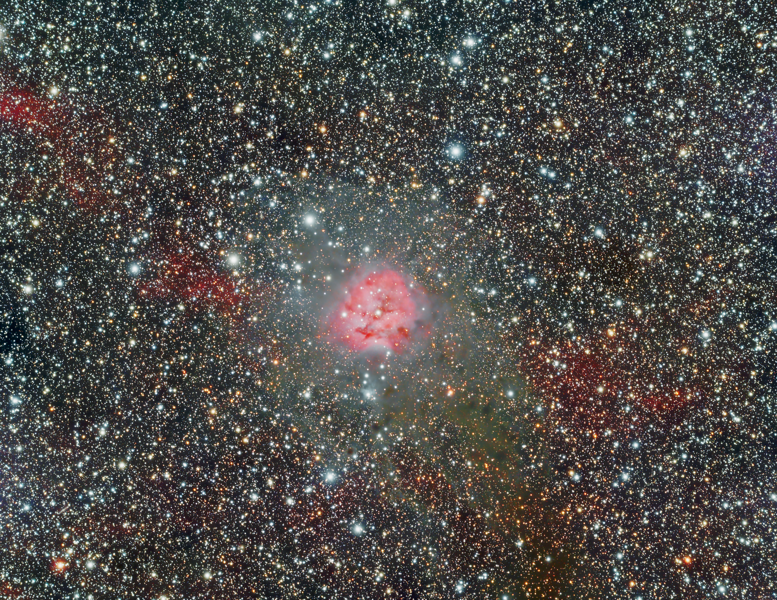 IC 5146 wurde in meiner kleinen Remotesternwarte in Deidesheim mit rund acht Stunden Belichtungszeit über zwei Nächte aufgenommen. Verwendet wurde ein IDAS LPS D3 Filter um das störende Licht aus der Nachbarschaft zu reduzieren. Der Stack lief über Deepskystacker, die EBV über Fitswork und PS2020 Elements.