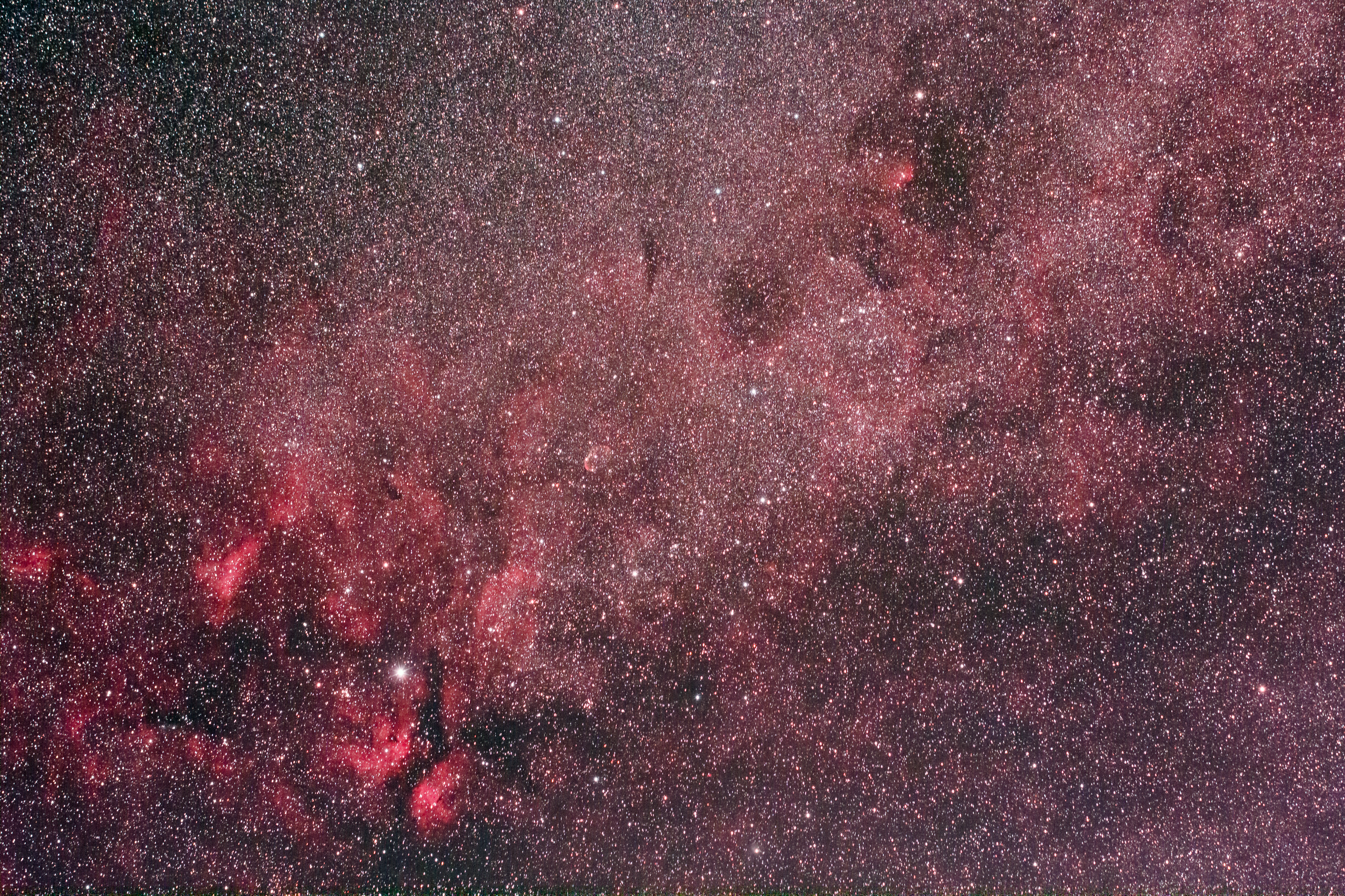 In den Nächten vom 23. auf den 24. und vom 24. auf den 25. Mai war es zum ersten Mal seit zweieinhalb Monaten wieder soweit, dass eine klare Nacht auf ein Wochenende fiel, und so fand ich in diesen beiden Nächten nicht viel Schlaf. In der Nacht vom 24. auf den 25. Mai nahm ich dann mit meinem 100-Millimeter-Makro-Objektiv die Region um Sadr auf, also mitten im "Herz" des Sternbilds Schwan, wobei dieses Bild entstand.