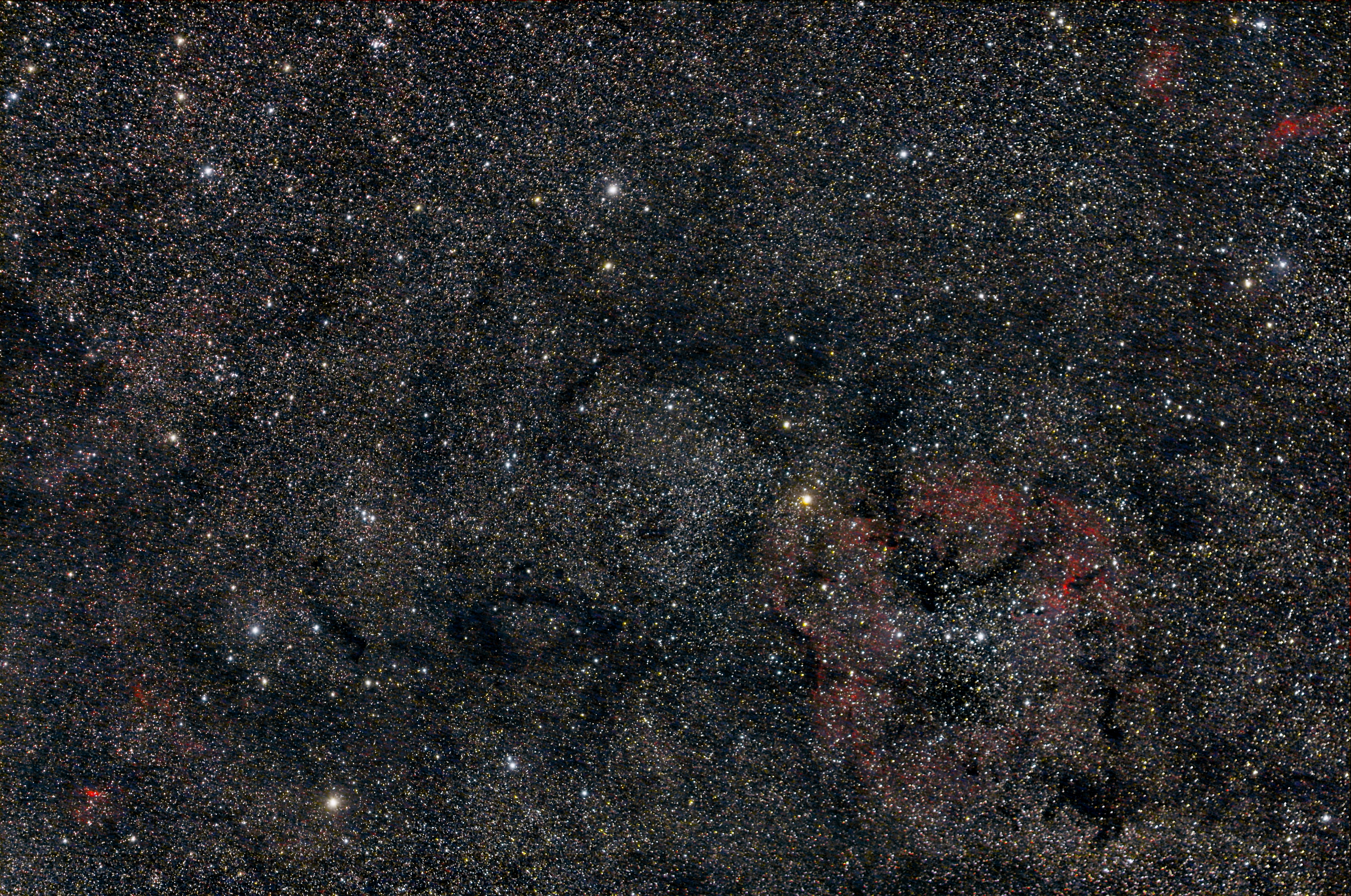 Das Sternbild Kepheus ist auch für Widefield-Aufnahmen ein lohnendes Gebiet. Gerade das Gebiet um IC 1396 wartet mit einer Vielzahl von Emissionsnebeln und schönen Dunkelwolken auf. Bei dieser Aufnahme war der Himmel wohl nicht so gut wie ich dachte, auch sind 85 Minuten Gesamtbelichtungszeit etwas wenig. Aber um das bunte, abwechslungsreiche Geschehen im Kepheus zu zeigen reicht es vielleicht doch.