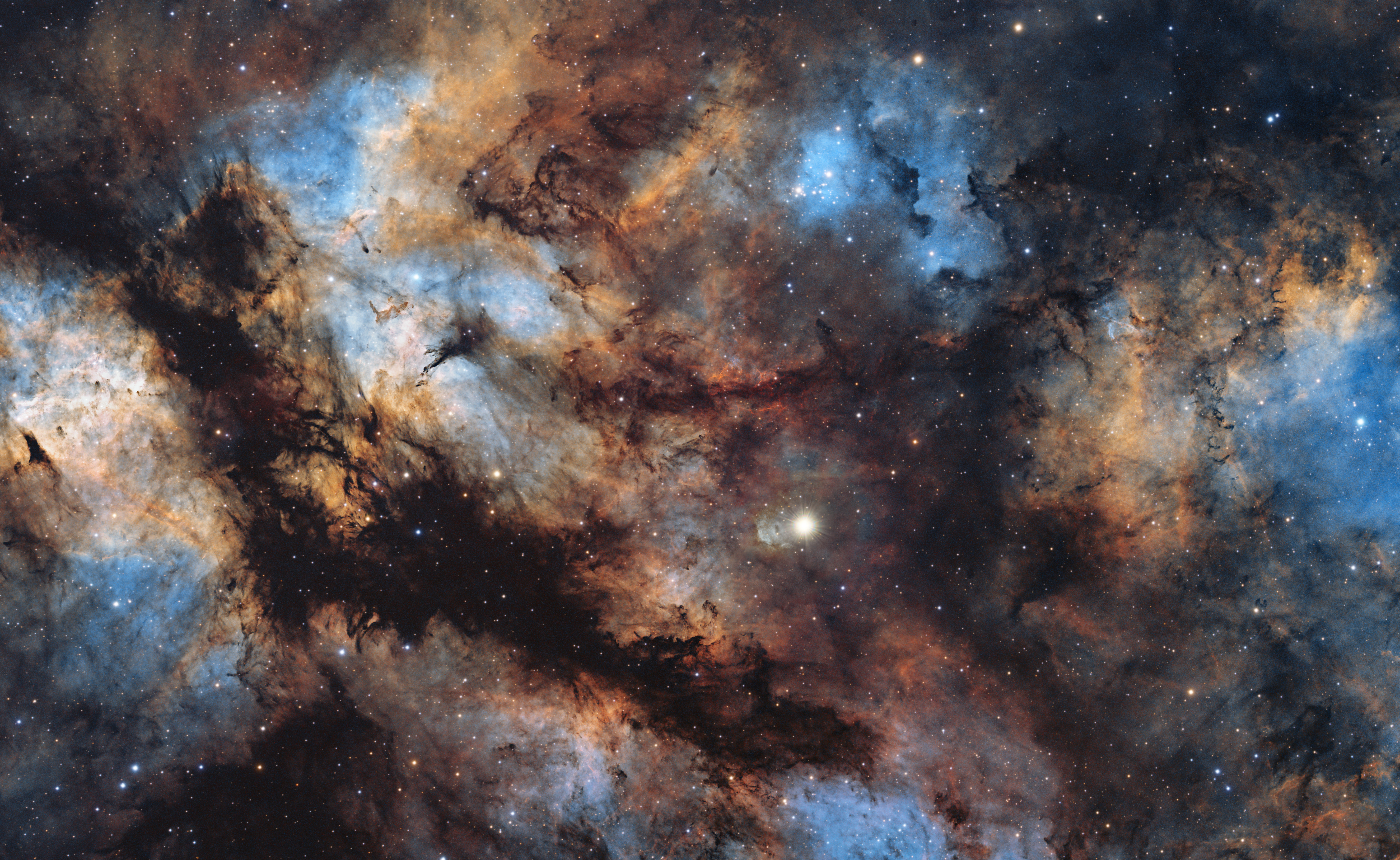 Ein Blick ins Zentrum des Schmetterlingsnebels im Schwan zeigt, wie viele faszinierende Gas- und Dunkelwolken dort zu finden sind, die ich versucht habe, in dieser SHO-Version herauszuarbeiten.