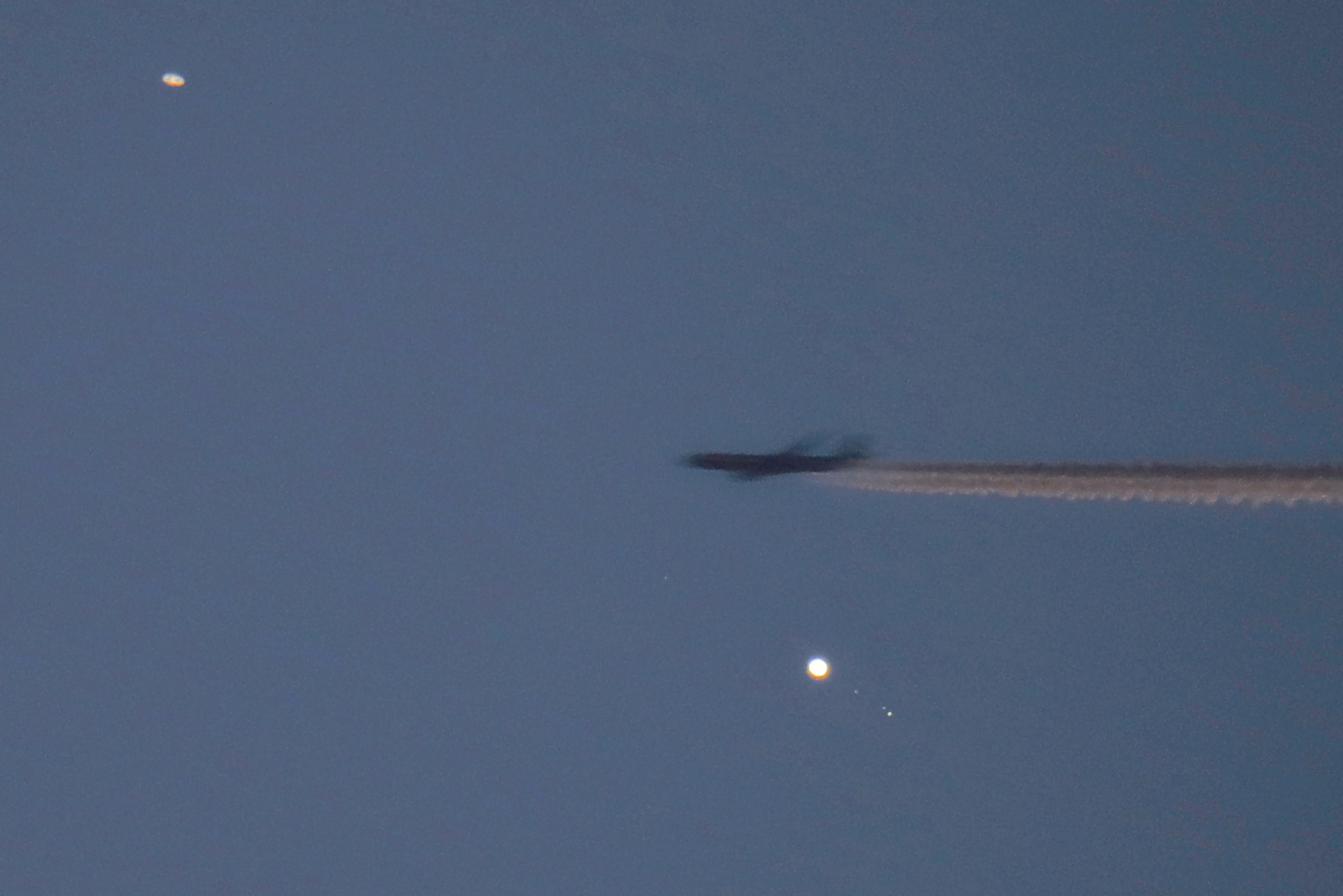 Ein plötzlicher dunkler Wischer im Bildfeld ließ mich instinktiv sofort den Fernauslöser der Kamera drücken und ...., jawohl, ich war schnell genug! Die interplanetare dreifach Konjunktion war im Kasten.