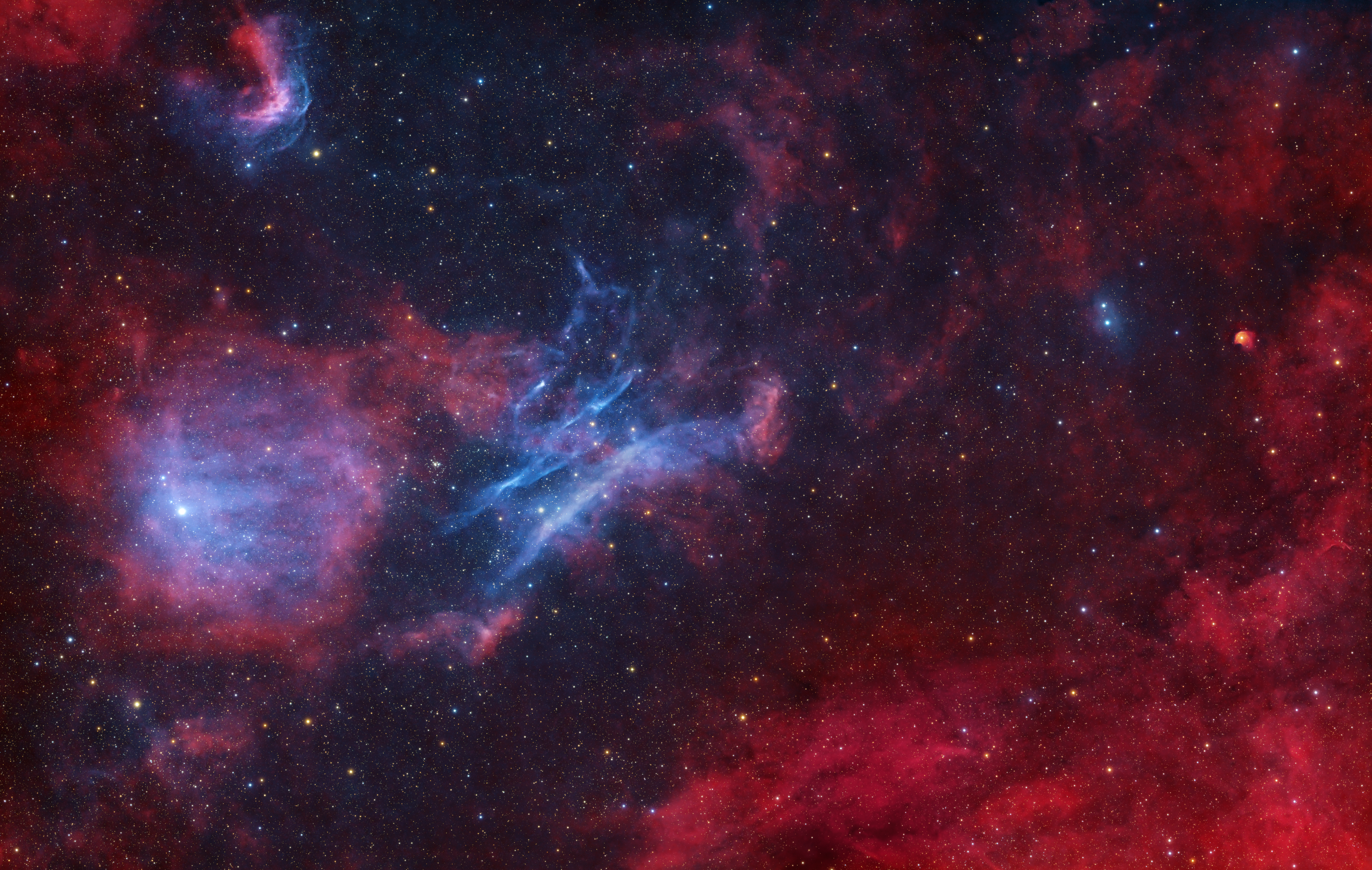 Seit einiger Zeit hatte ich den Wunsch, ein wirklich seltenes, schwaches Objekt zu fotografieren, das bisher kaum aufgenommen wurde. Daher bin ich sehr stolz darauf, das zweite Bild präsentieren zu können, auf dem diese interstellaren Hüllen in Kassiopeia überhaupt sichtbar sind, und gleichzeitig ist es das erste Foto, das die Hüllen dank der langen Belichtungszeit so deutlich zeigt. Dank einiger klarer Nächte im Herbst konnte ich mit dem RASA bei f/2 knapp 39,5 Stunden Schmalbanddaten aufnehmen und zusätzlich noch eine Stunde RGB für die Sterne. Die Bearbeitung war wirklich anspruchsvoll, aber letztlich konnte ich viele Details in den OIII-Strukturen und auch in den sie umgebenden H-Alpha-Wolken herausarbeiten. Auch wenn im fertigen Bild die Gaswolken fast schon strahlend leuchten, so sind es trotzdem unglaublich lichtschwache Objekte, wodurch die Bearbeitung eine echte Herausforderung war.