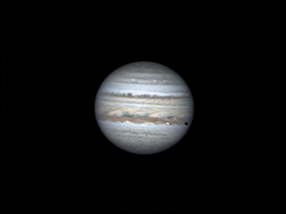 Io zieht vor Jupiter vorbei und der Schatten des Mondes ist gerade vor die Planetenscheibe eingetreten. Aufnahmeort: Sternwarte der Farm Rooisand, Namibia