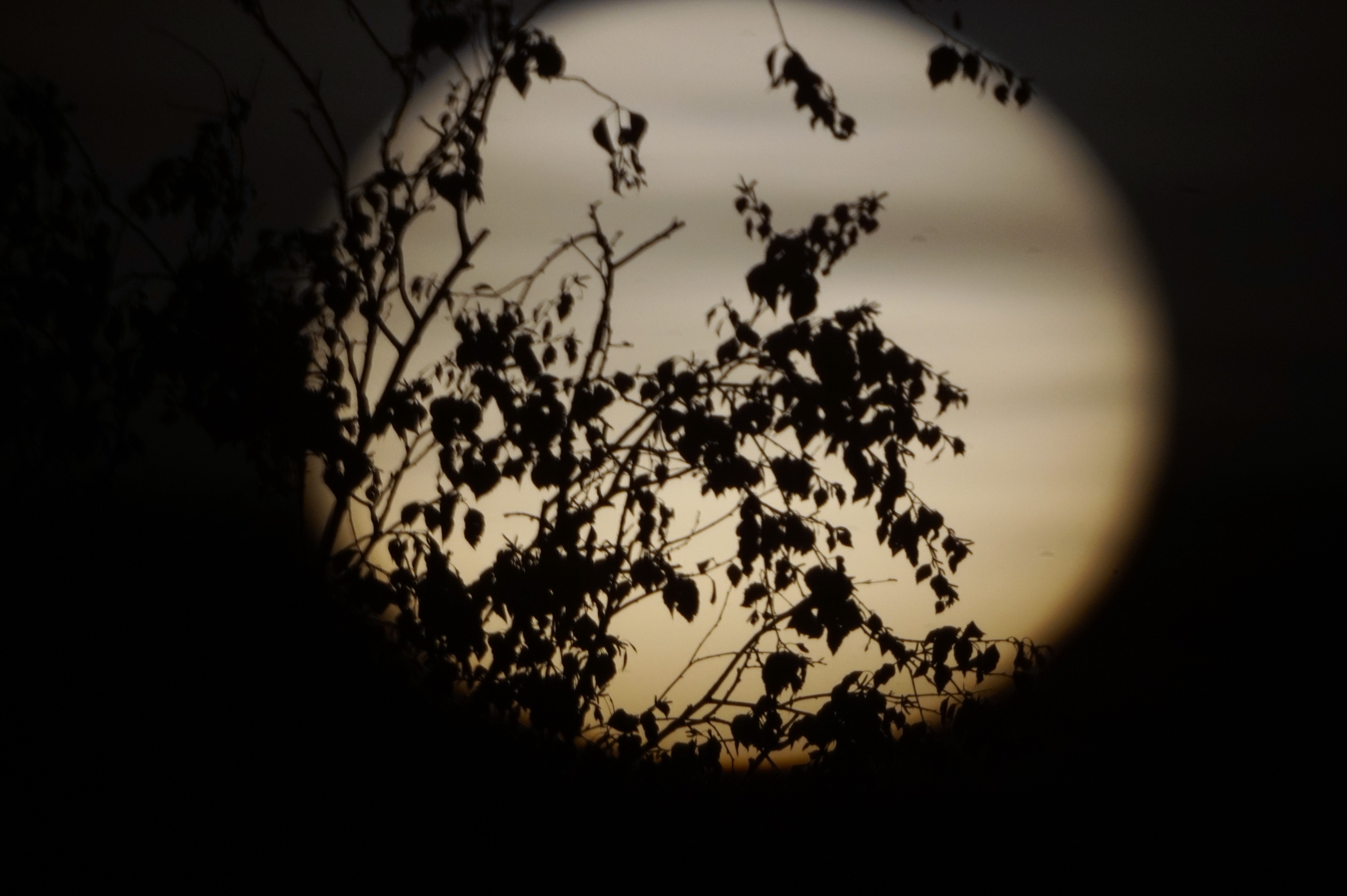 Habe den Sonnenuntergang fotografiert. Kurz bevor die Sonne den Horizont erreichte, schien sie durch einen Blätterwald.