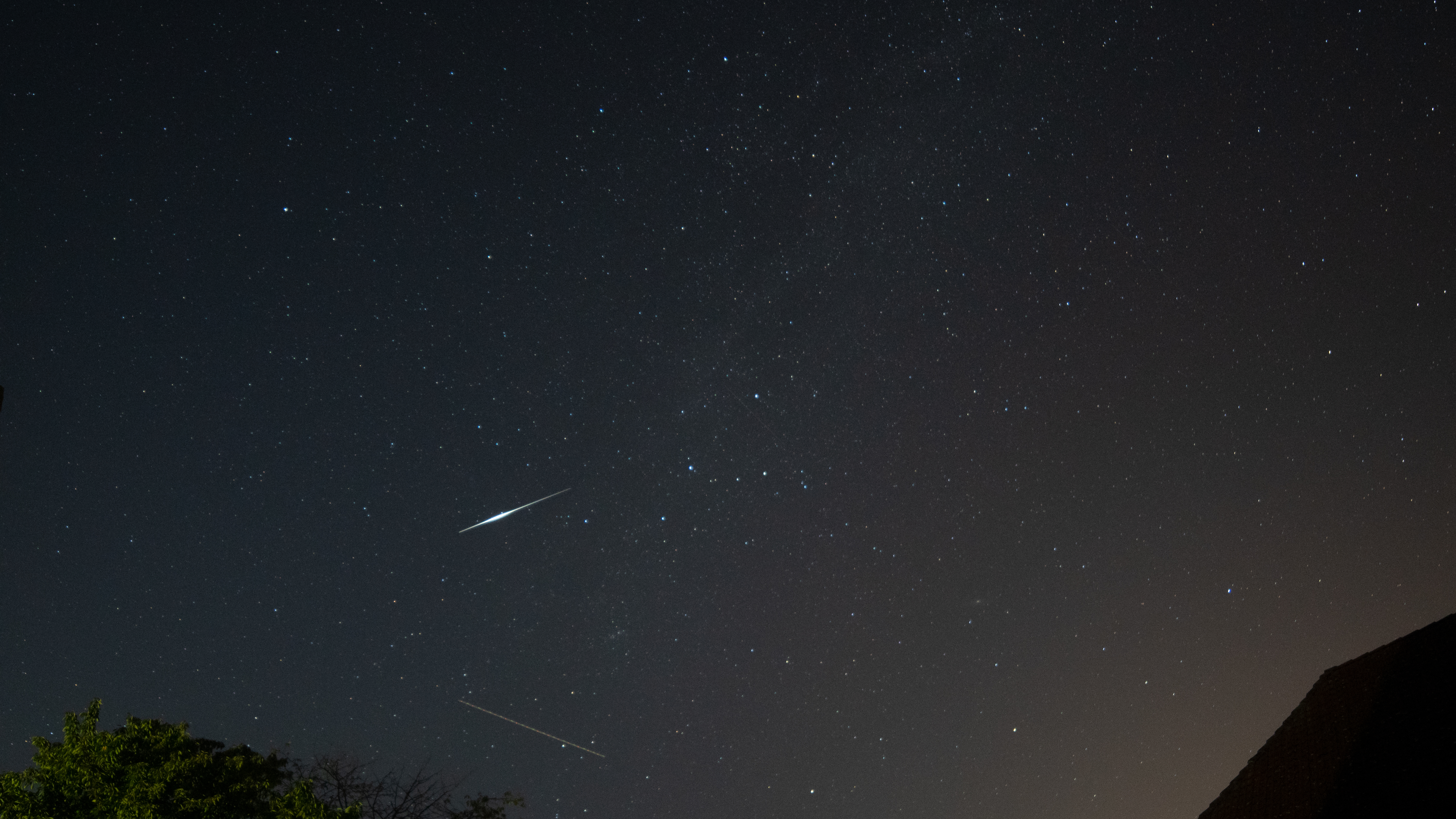 Bei dem Versuch die ersten Perseiden zu erhaschen, ergab sich am 11. August 2021 um 22:48 Uhr dieses Bild eines extrem hell aufleuchtenden Satelliten. Sowohl das Bild vorher als auch nachher zeigte eine schwache Leuchtspur vor und nach diesem Aufleuchten. Vermutlich einer der letzten Iridium-Flares.