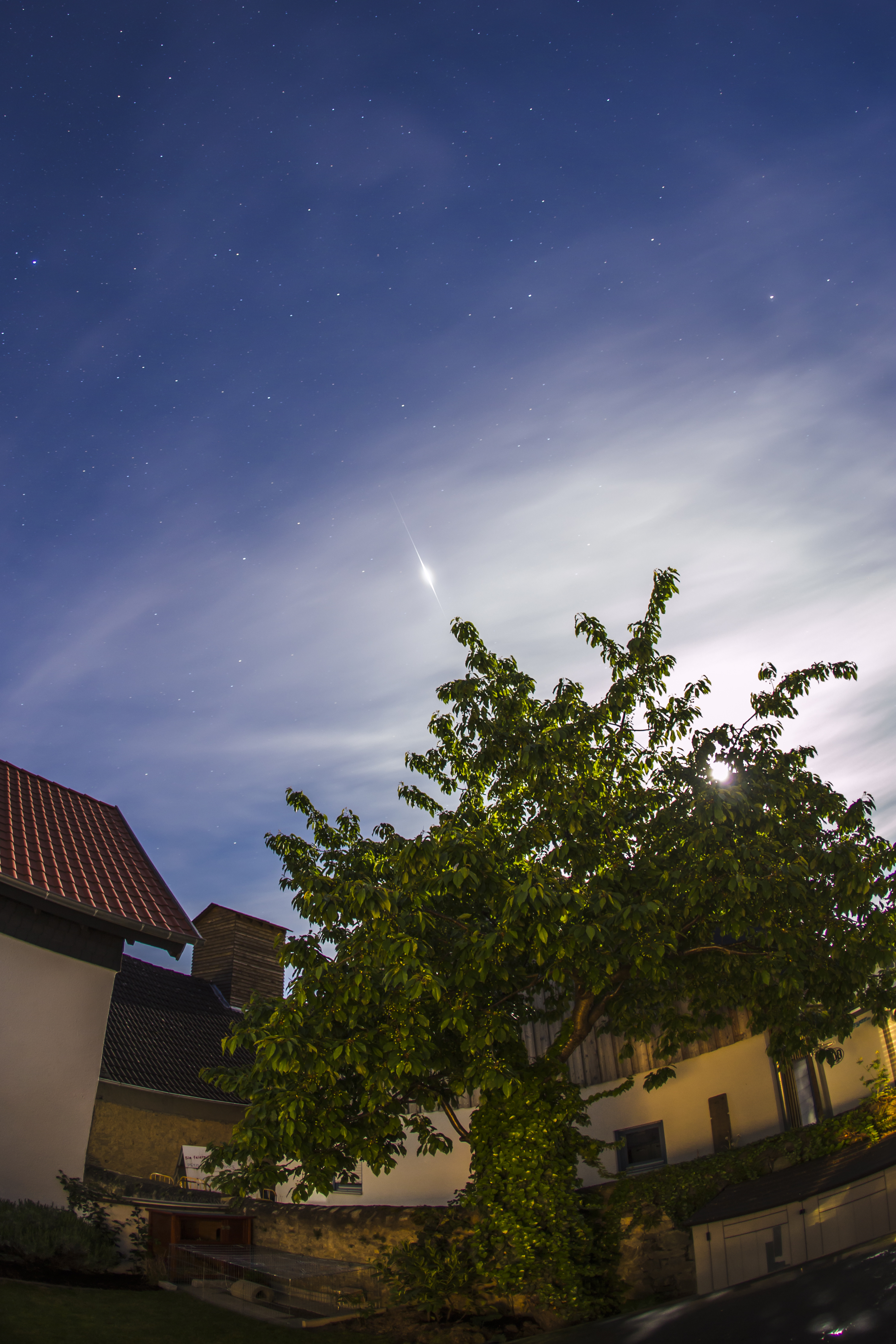Da die Iridium Satelliten nach und nach durch Modelle ersetzt werden sollen, die voraussichtlich keine der beliebten Flares mehr hervorrufen, nutze ich in letzter Zeit jede Gelegenheit, die Blitze zu sehen und fotografieren. Dieses Foto zeigt Iridium 21 bei einem Flare auf -8 mag über einem Kirschbaum (dahinter der Mond) mit Fisheye Objektiv.