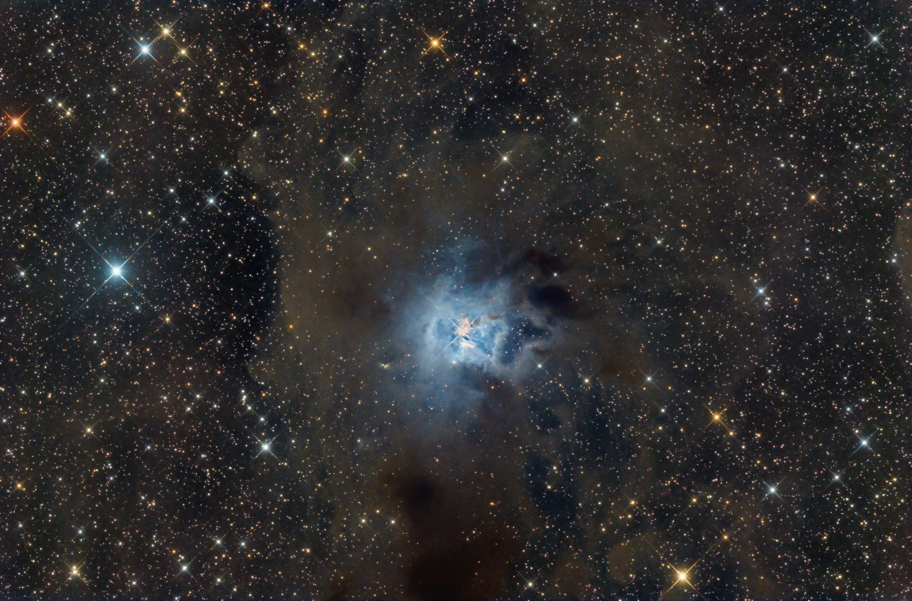 Der sich in rund 1300 Lichtjahren Entfernung befindliche bläuliche Reflexionsnebel erinnert in seinem Aussehen stark an das Bild einer Iris-Blume. Die dominante Farbe des Reflexionsnebels ist blau, da das Sternenlicht des zentralen hellen jungen Sterns an den Staubpartikeln gestreut wird. Die schwachen rot sichtbaren Filamente im Zentralbereich entstehen durch Fotolumineszenz, da ein Teil der Staubpartikel das unsichtbare UV-Licht in sichtbares rötliches Licht konvertiert. Der blaue Zentralbereich des Iris-Nebels weist einen Durchmesser von rund sechs Lichtjahren auf. Aufgenommen im Spätsommer 2016 und 2017 und soeben ausgearbeitet 2018.