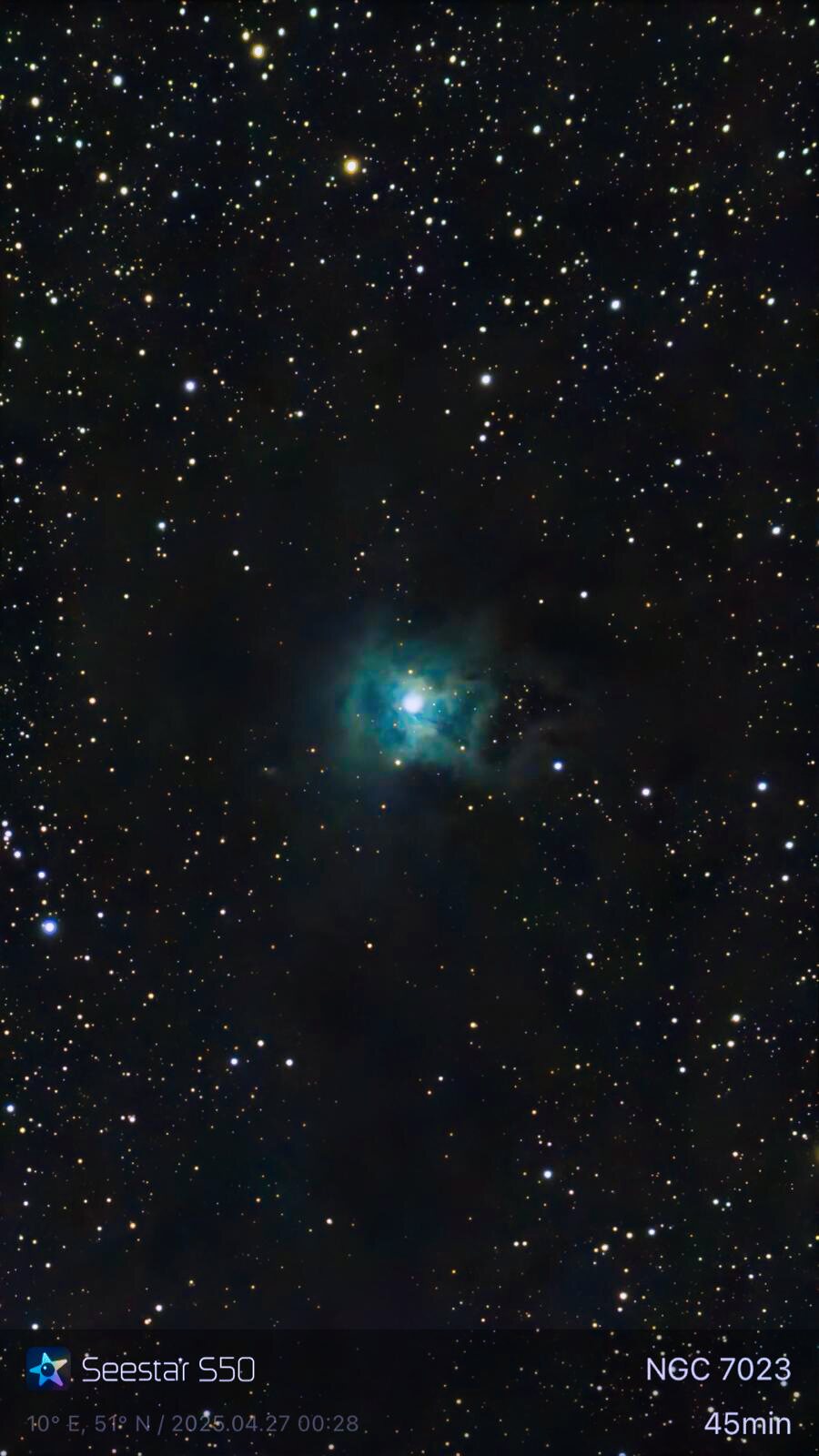 NGC 7023 / Irisnebel, im Sternbild Kepheus aufgenommen am 27. April 2025 mit dem Smartteleskop Seestar S50 (mit einfachen Mitteln die Original JPG schnell nachbearbeitet).