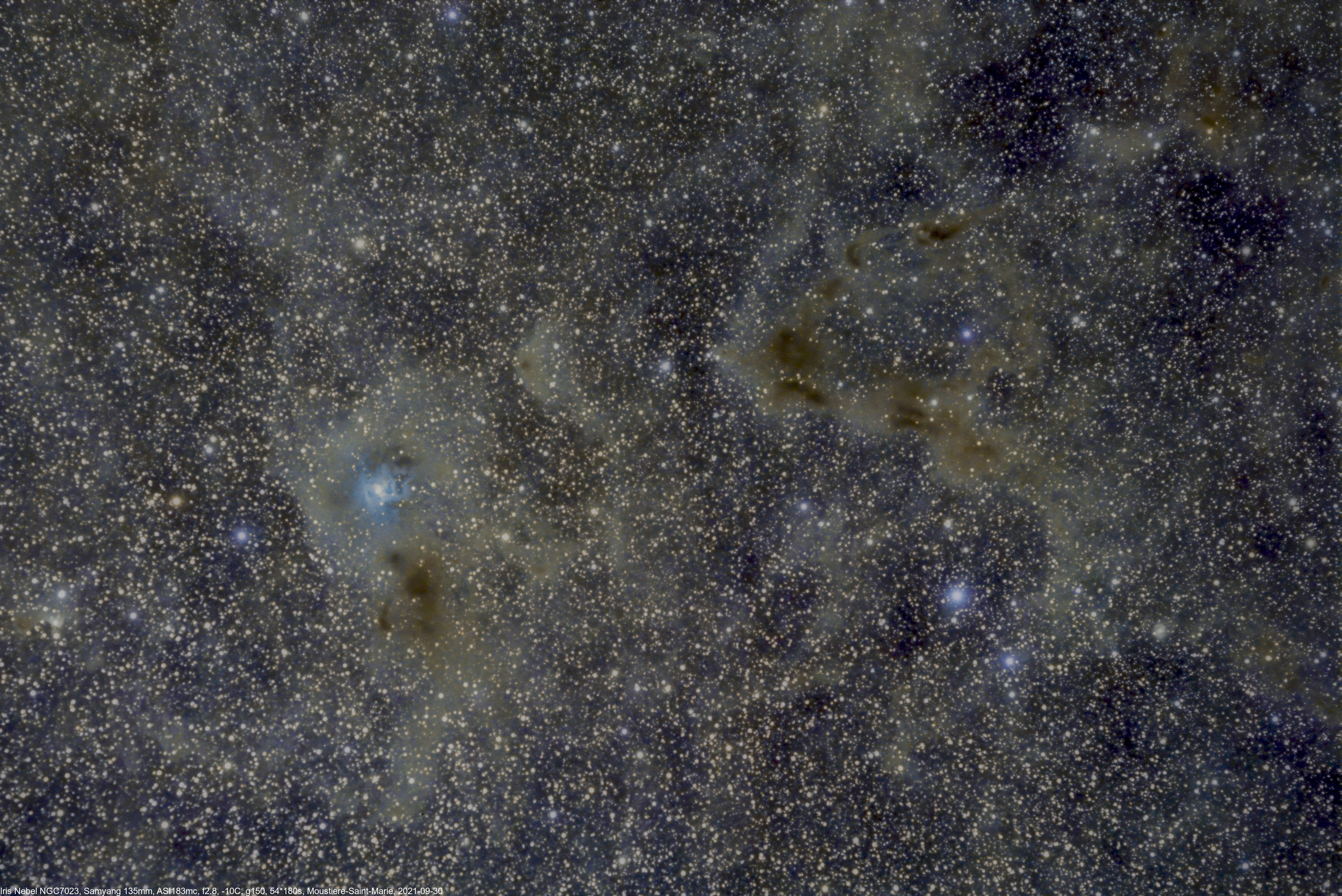 Inmitten dunkler, interstellarer Staubwolken leuchtet der türkisblaue Irisnebel wie eine kleine Blume oder ein kleiner Edelstein. Er wird vom hellen Stern in seiner Mitte zum Leuchten angeregt. Mein Großfeldaufnahme zeigt ihn vor etwa 1300 Jahren. Der hungrige Geist auf der rechten Seite wird ihn sicher noch nicht verschluckt haben.