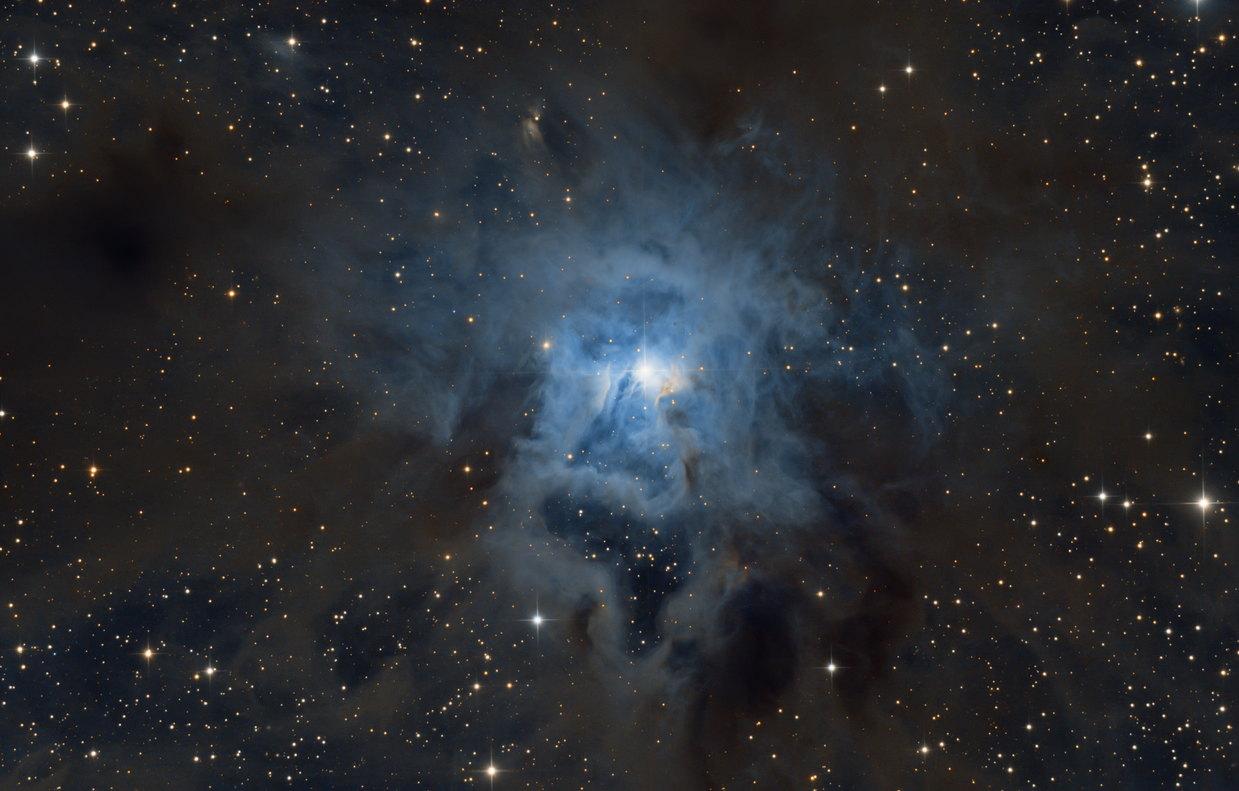 Der Irisnebel im Sternbild Kepheus ist ein sehr schöner Reflexionsnebel. Angeregt durch den Zentralstern, reflektiert der umgebende Staub das Licht in zartem Blau, die Zentralfilamente sogar leicht rötlich, da unsichtbare Strahlung in sichtbares Licht konvertiert wird.
