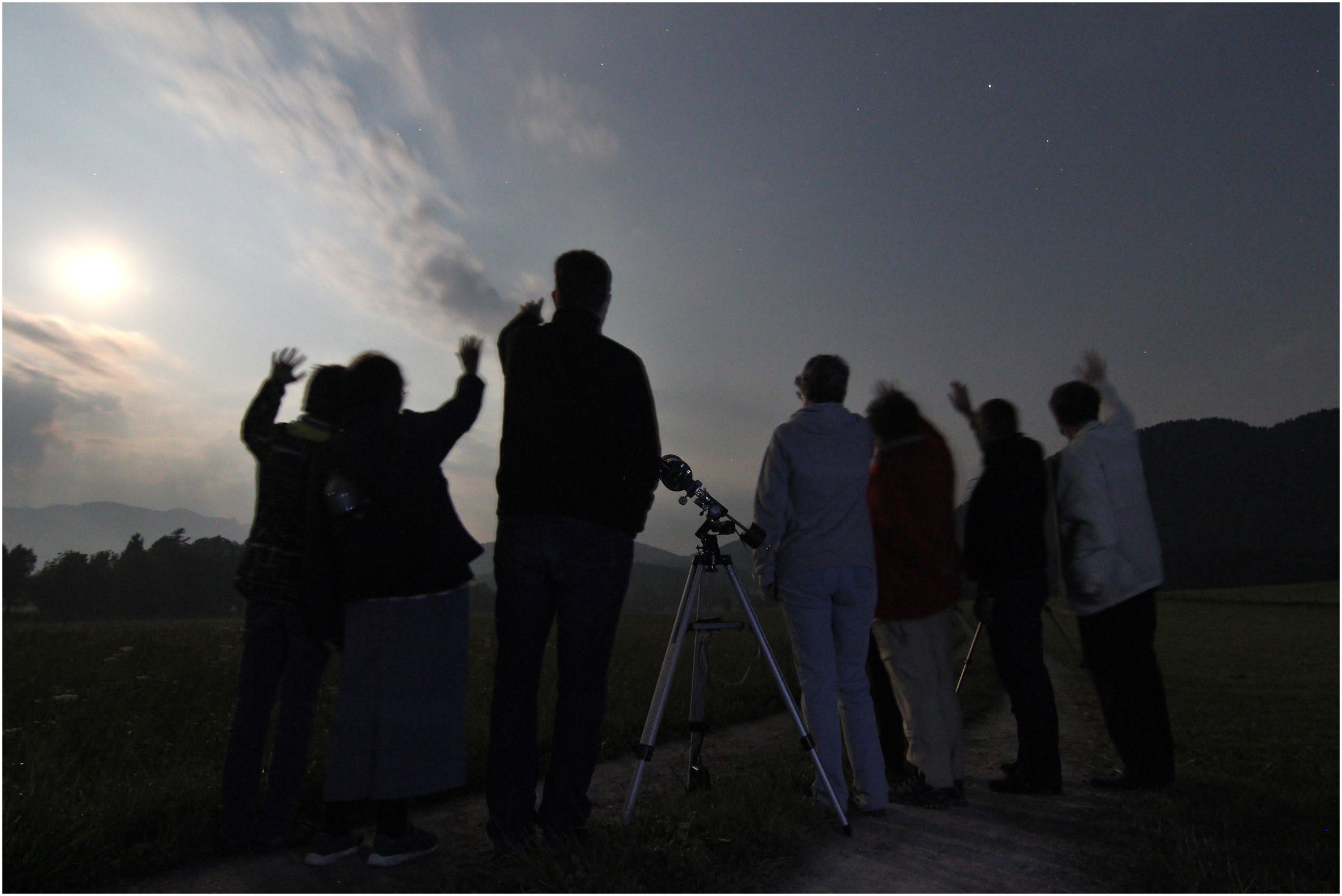 Der Aufforderung des JPL der NASA dem Saturn zu winken, wenn die Saturnsonde Cassini am 19.7.2013 Aufnahmen des Ringplaneten mit der Erde im Hintergrund macht, kamen weltweit viele Sternfreunde nach. Auch die Isarwinkler Sternfreunde waren dabei und warteten geduldig ab, ob sich nach einem Regenschauer die Bewölkung wieder auflockern würde, um rechtzeitig noch das Winke-Gruppenfoto mit Saturn (rechts neben dem Fernrohr) auf den Chip zu bannen. Das Warten wurde belohnt, und so können wir jetzt sagen, dass wir auf dem winzigen, bläulichen Lichtpünktchen unterhalb der Saturnringe auf dem Cassinifoto ganz bewusst bei dieser interplanetaren Fotosession dabei waren!