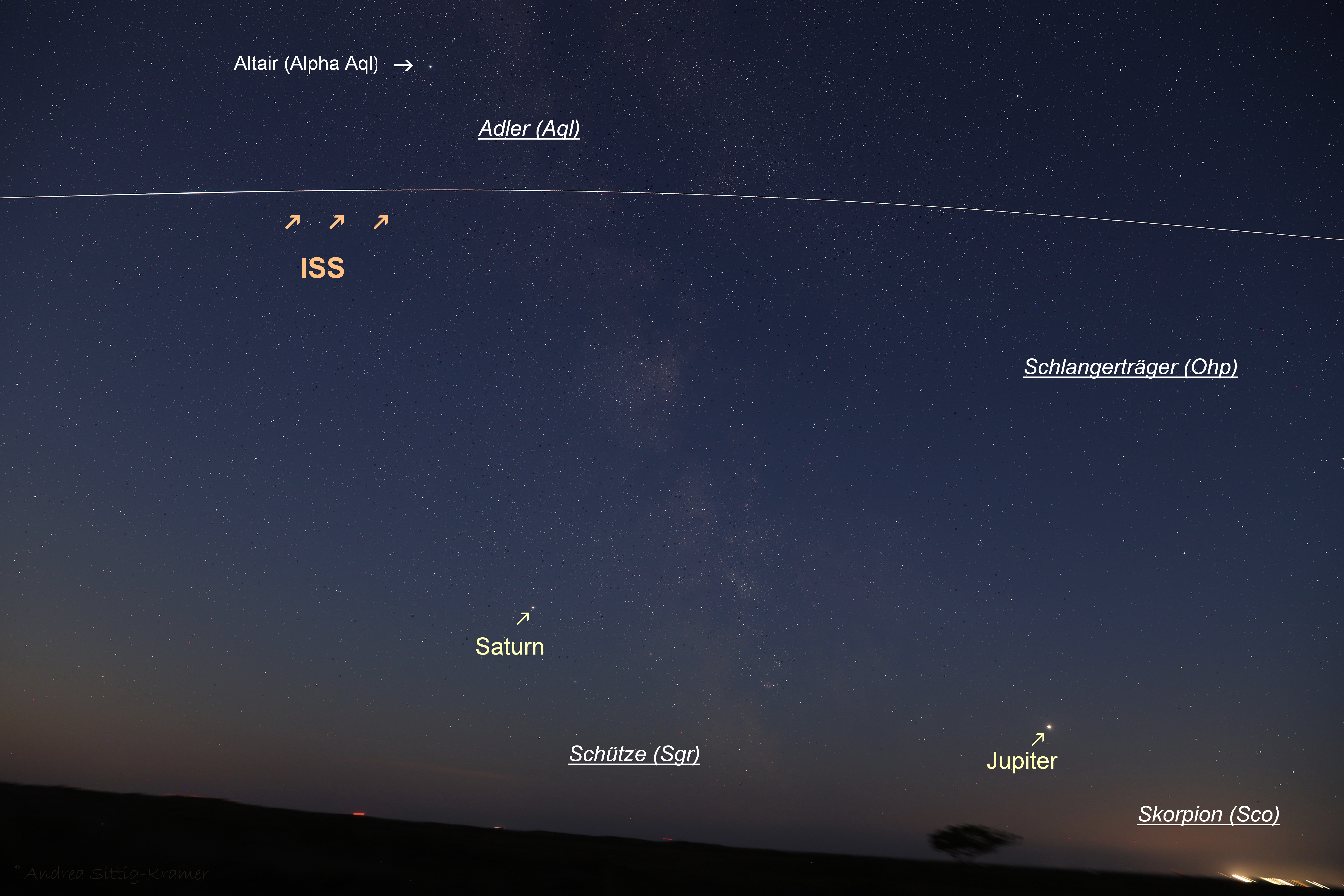 Gegenwärtig sind allabendlich mehrere Überflüge der Internationalen Raumstation ISS am Himmel zu beobachten. Auf der dänischen Nordseeinsel Rømø war in der Nacht 22./23. Juli 2019 ein wunderschöner wolkenfreier Himmel, so dass ich den Überflug kurz nach Mitternacht fotografisch festhalten konnte. Die ISS flog von meinem Standort, direkt hinter dem Deich, aus genau über Jupiter und Saturn und vor den Sternbilder Schlangenträger und Adler. Unten rechts im Bild erhellen die Lichter von Sylt den Horizont. Eine wirklich tolle Gesamt-Konstellation vor dem Hintergrund der Milchstraße!