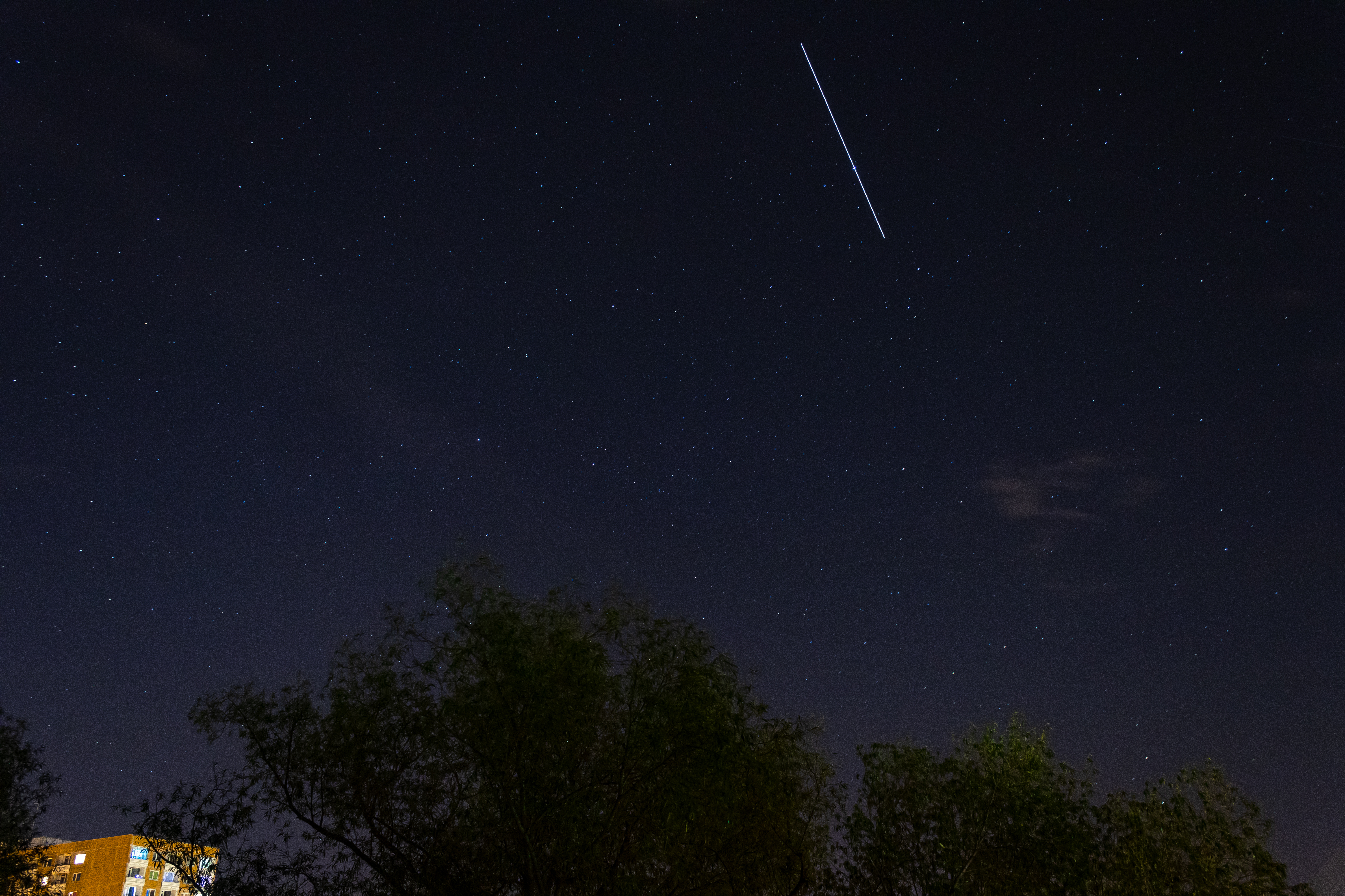 Heute Abend bedeckte die ISS bei ihrem Überflug kurzzeitig den Hauptstern im Sternbild Leier. Diesmal war ich genau auf der Zentrallinie (dort wo die Bedeckung sichtbar ist) ohne das Haus zu verlassen. Die Breite der Zentrallinie ist bei so einer Bedeckung sehr sehr schmal, weit unter 100 Meter. Durch die Belichtungszeit von 20 Sekunden ist Vega ein paar Pixel weiter gewandert und ganz leicht sichtbar.