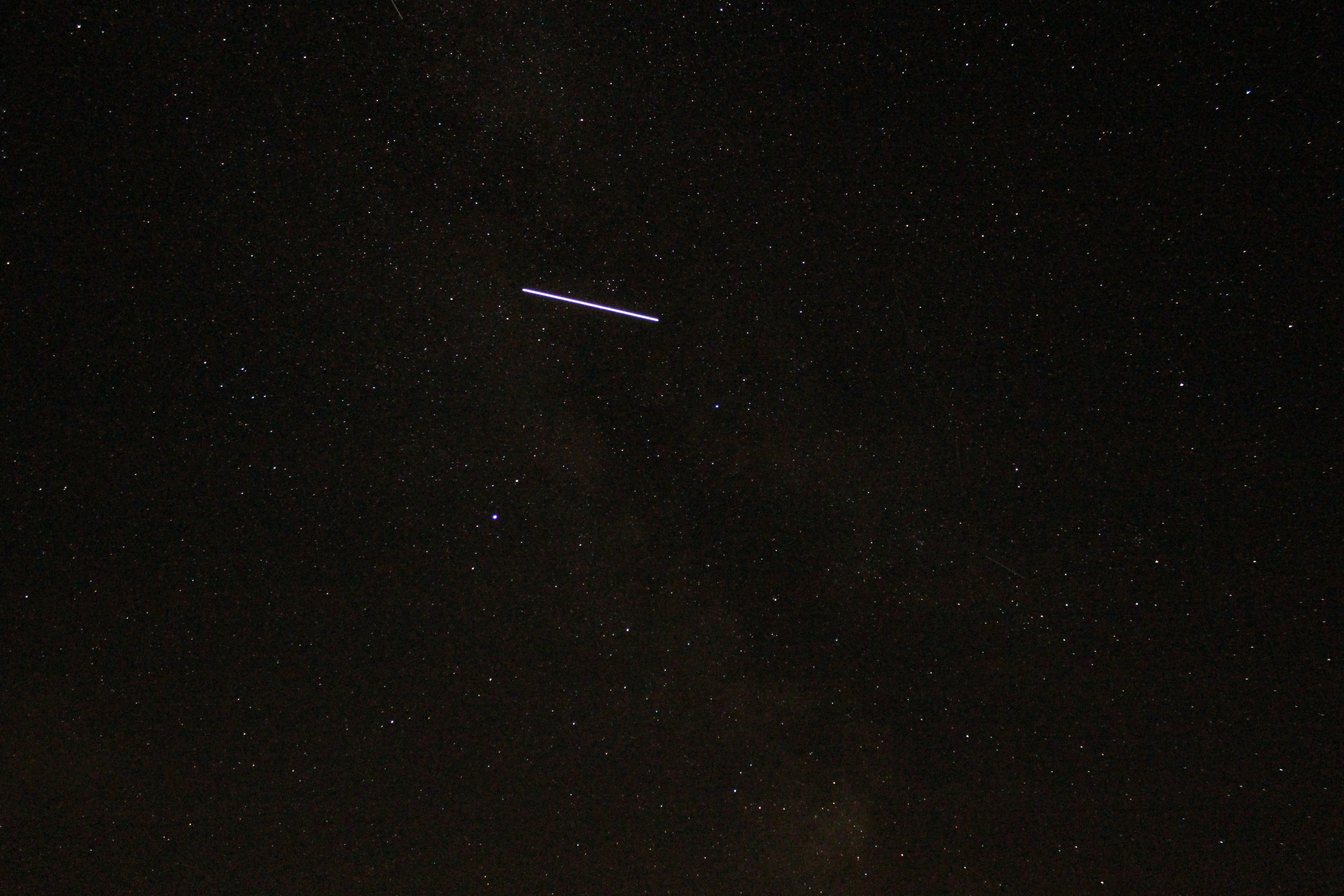 Die ISS durchquert die Milchstraße nördlich des Sternbilds Pfeil. Das Bild wurde im Naturschutzgebiet Lange Rhön, östlich des Heidelsteins, aufgenommen.