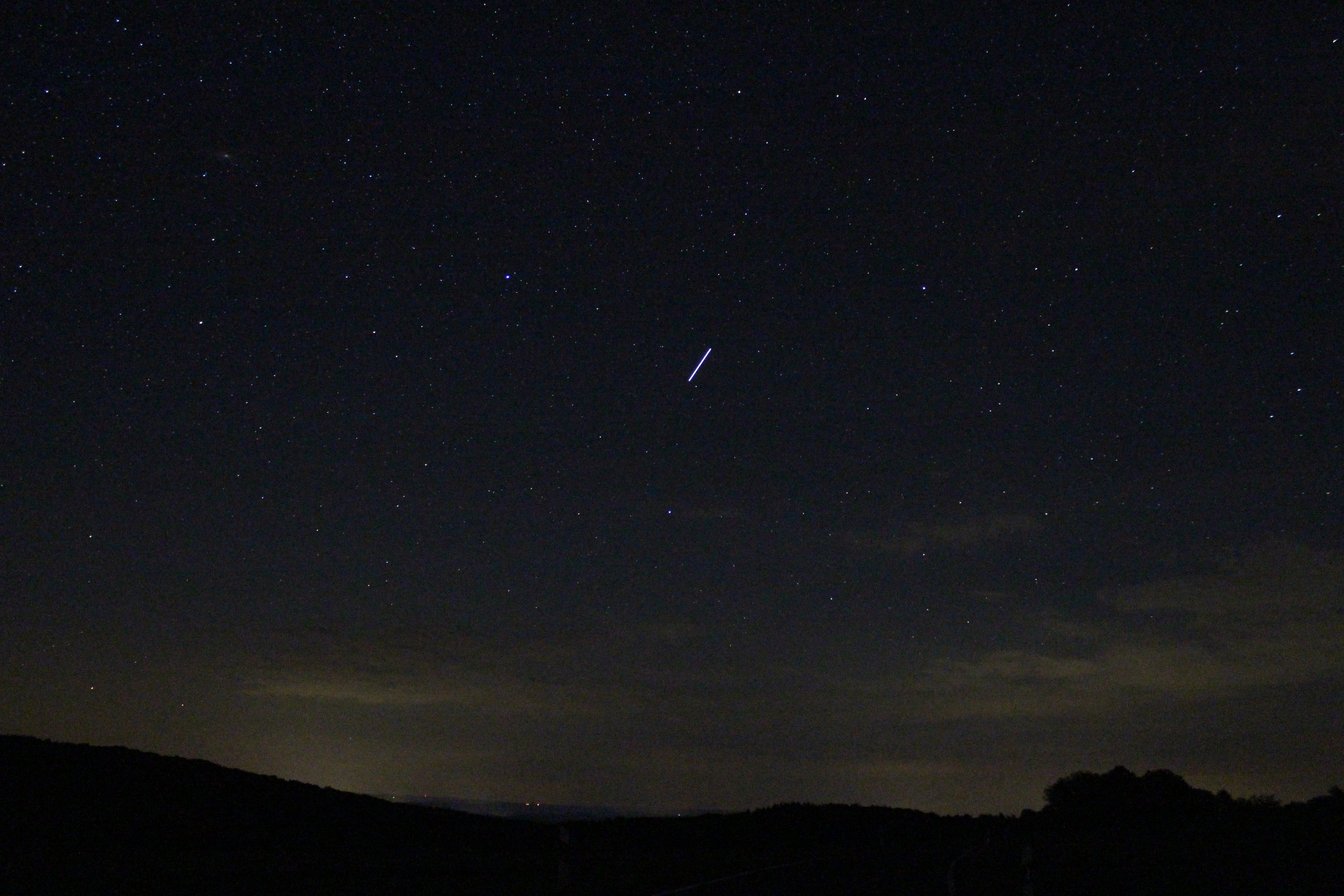 Die ISS, deren Helligkeit gegenüber dem vorherigen Bild merklich abgenommen hat, durchquert im weiteren Verlauf ihrer Wanderung über das Himmelsgewölbe das Pegasusviereck. Das Bild wurde im Naturschutzgebiet Lange Rhön, östlich des Heidelsteins, aufgenommen.