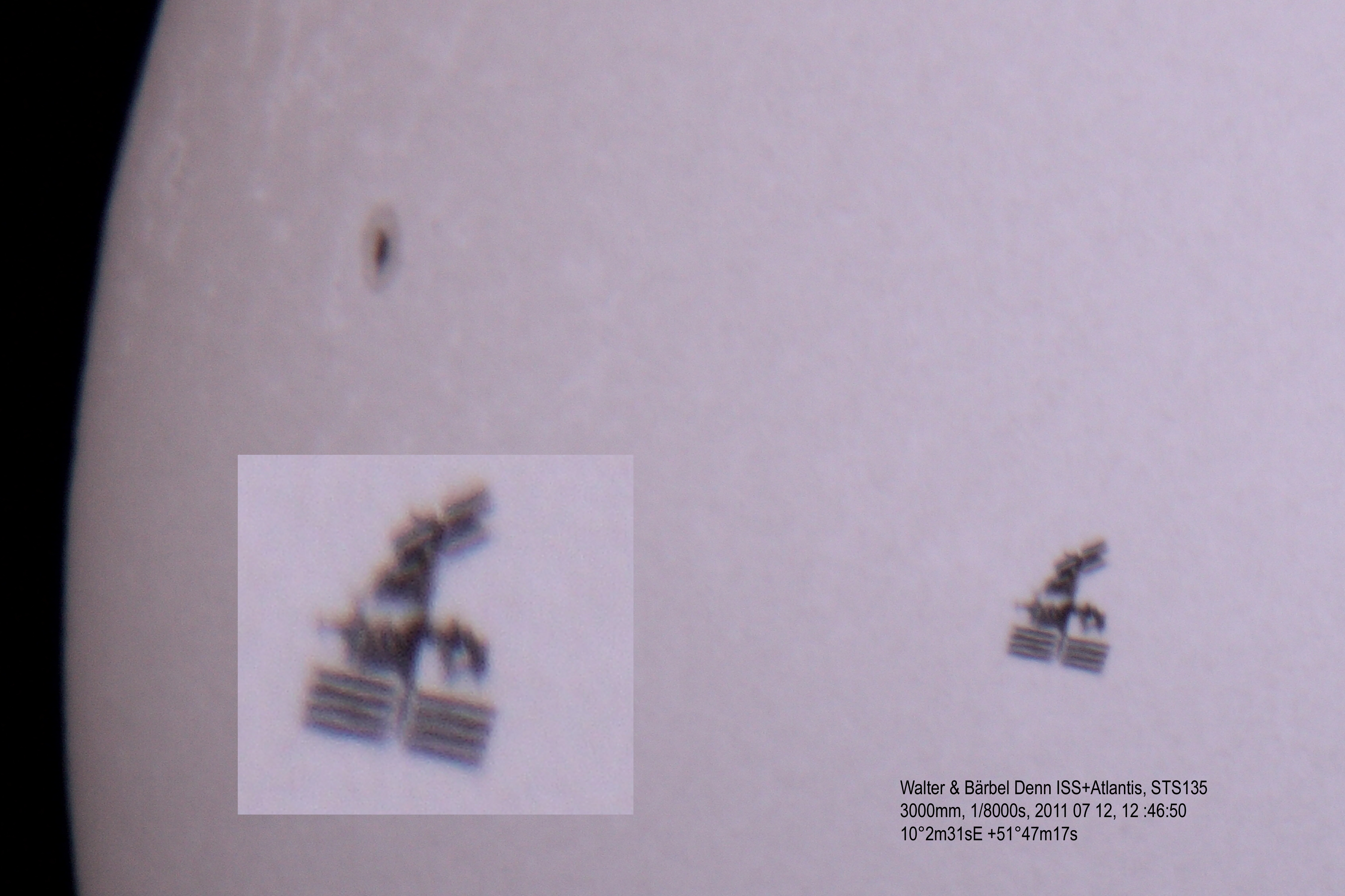 Dieses Bild zeigt die Atlantis rechts angedockt an die ISS, es ist am 12. Juli 2011 in Kalefeld entstanden. Die ISS hat sich in nur 0,57 s über die Sonnenscheibe in Ziffernblattrichtung 9:55 bewegt, die Breite des Bodenpfades betrug 4,9 km. Das Raumschiff hatte um 12:46:19 Uhr MESZ einen Abstand zur Erde von 457 km. Die Beobachtungsdaten wurden mit Calsky berechnet.