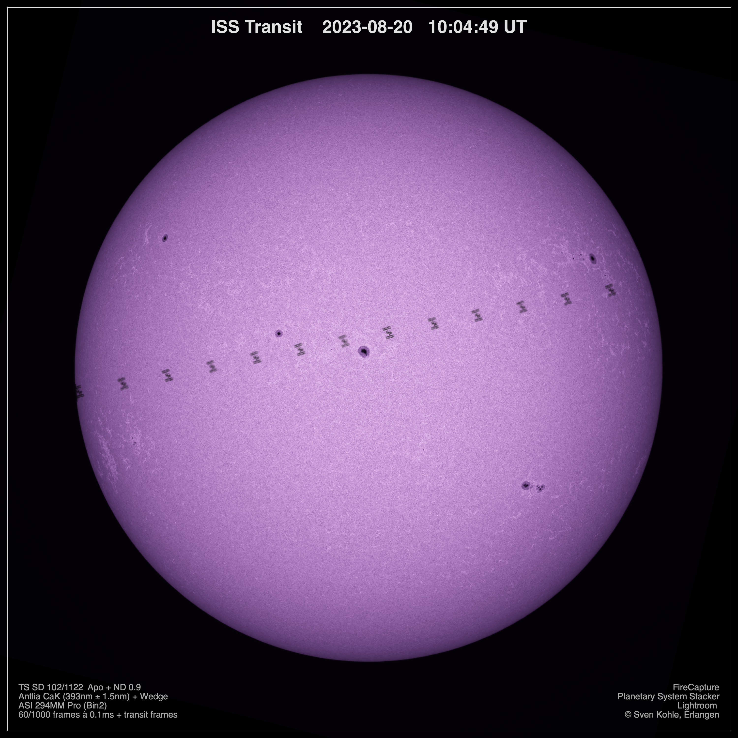 Exakt wie geplant und Glück mit dem Wetter, der ISS-Transit konnte mit zwei Teleskopen parallel im Licht des Kalzium und H-Alpha verfolgt werden.