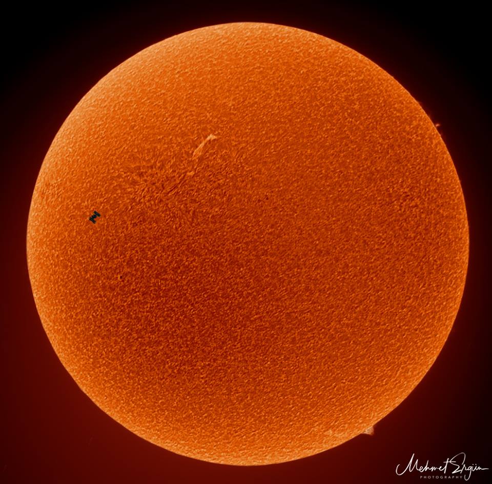 ISS Transit in H-Alpha. 27. Juni 2018 in Vallendar / Germany ⏰12:38:30. Die ISS war knapp 420 km über mir, sie ist mit einer Geschwindigkeit von rund 25000 km/h zwischen der Sonne und meiner Linse geflogen. Um solch eine Aufnahme zu fotografieren, benötigt man viel Planung und Autofahrt.