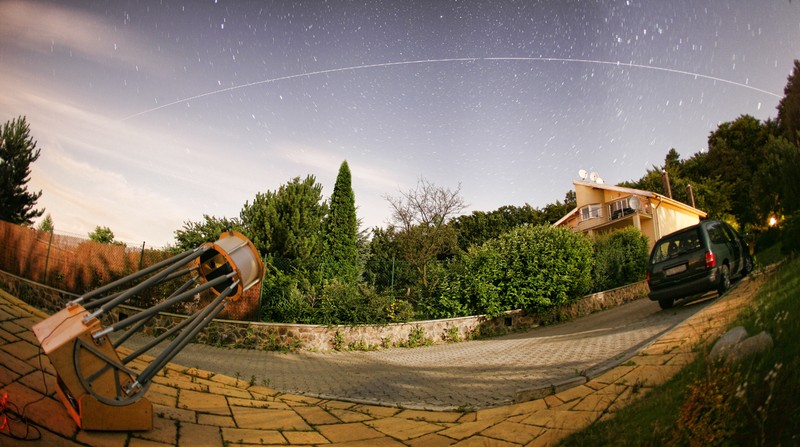 ISS traveling on the sky over small village Marianka. Big telescop on the left was used for taking ISS detailed photo.