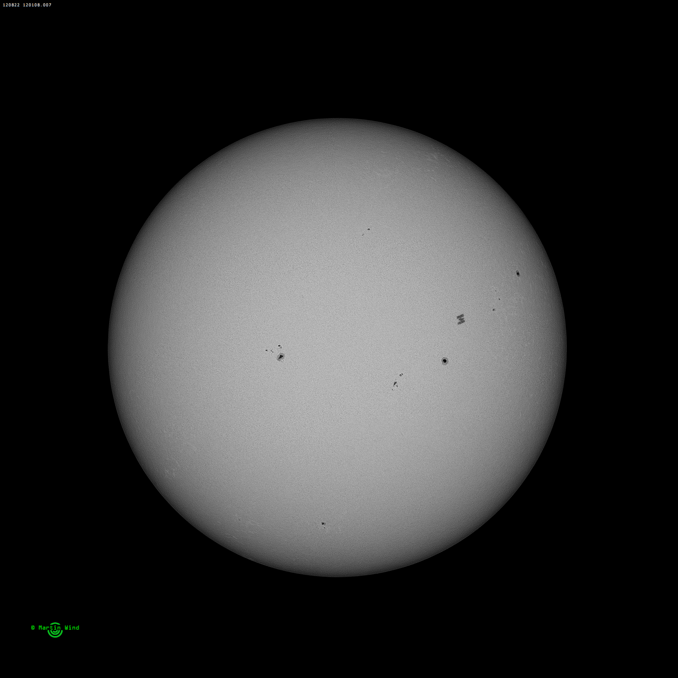 Freitag, den 12. August, war ein ISS-Transit für Köln berechnet - also hab ich mal mein Zeug im Grünen aufgebaut. Beim ersten Check hab ich auf den Bildern rein gar nix gesehen - kein Wunder - der Transit dauerte nur ca. eine halbe Sekunde. Auf zwei Frames war die ISS schlussendlich doch drauf. So ist mir doch mein erstes Foto der ISS vor der Sonne geglückt. ISS Entfernung ca. 550 km, Geschwindigkeit 7,4 km/s, Transitdauer ca 0,5 Sek.
