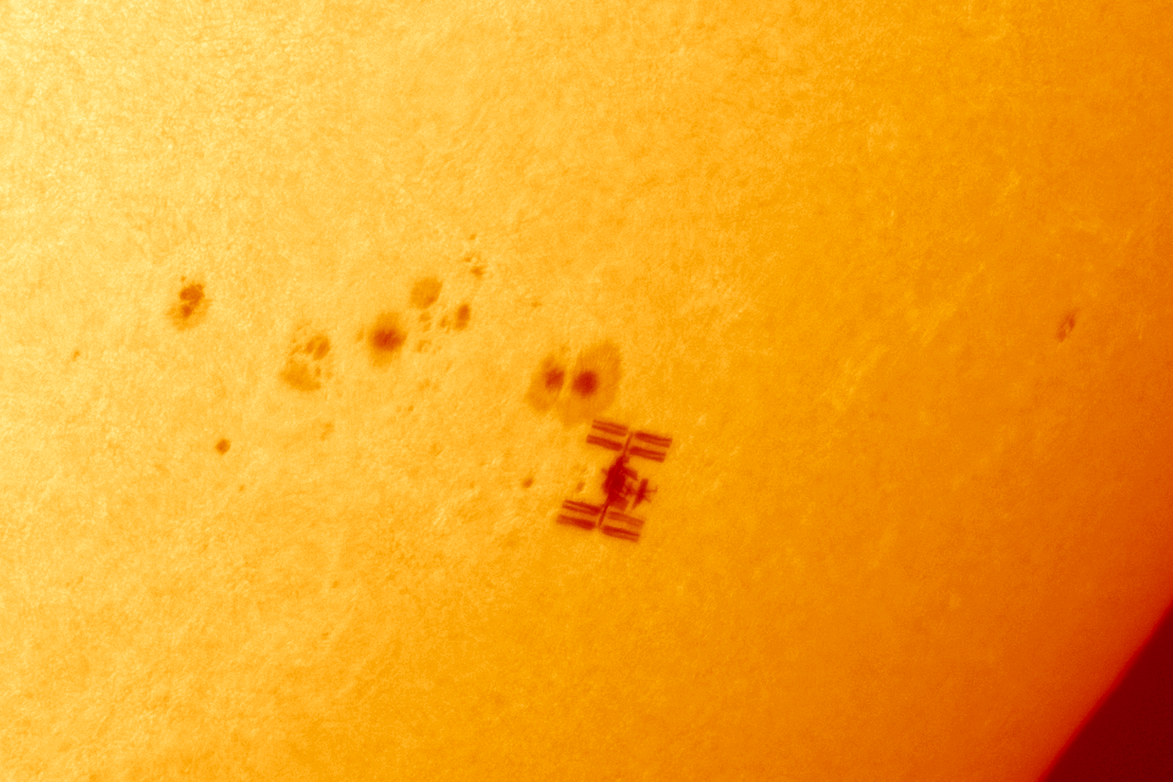 Das Einzelbild einer Videoaufnahme zeigt die Internationale Raumstation direkt vor der Sonnenfleckengruppe 4100.