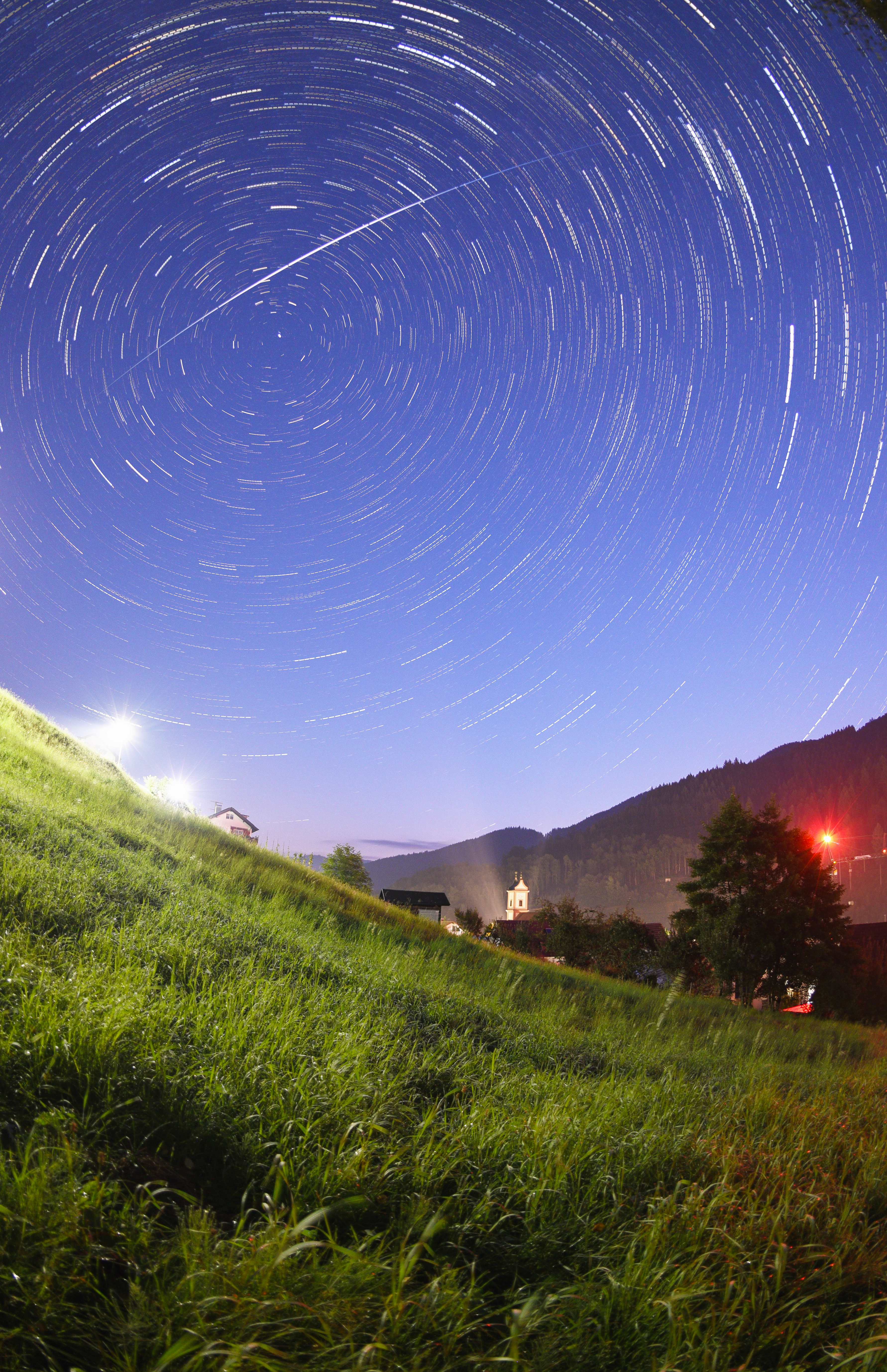 In dieser Nacht habe ich Sternstrichspuren am Himmelsnordpol fotografiert. Gegen Ende der Nacht flog sehr fotogen die Internationale Raumstation durch das Bild.