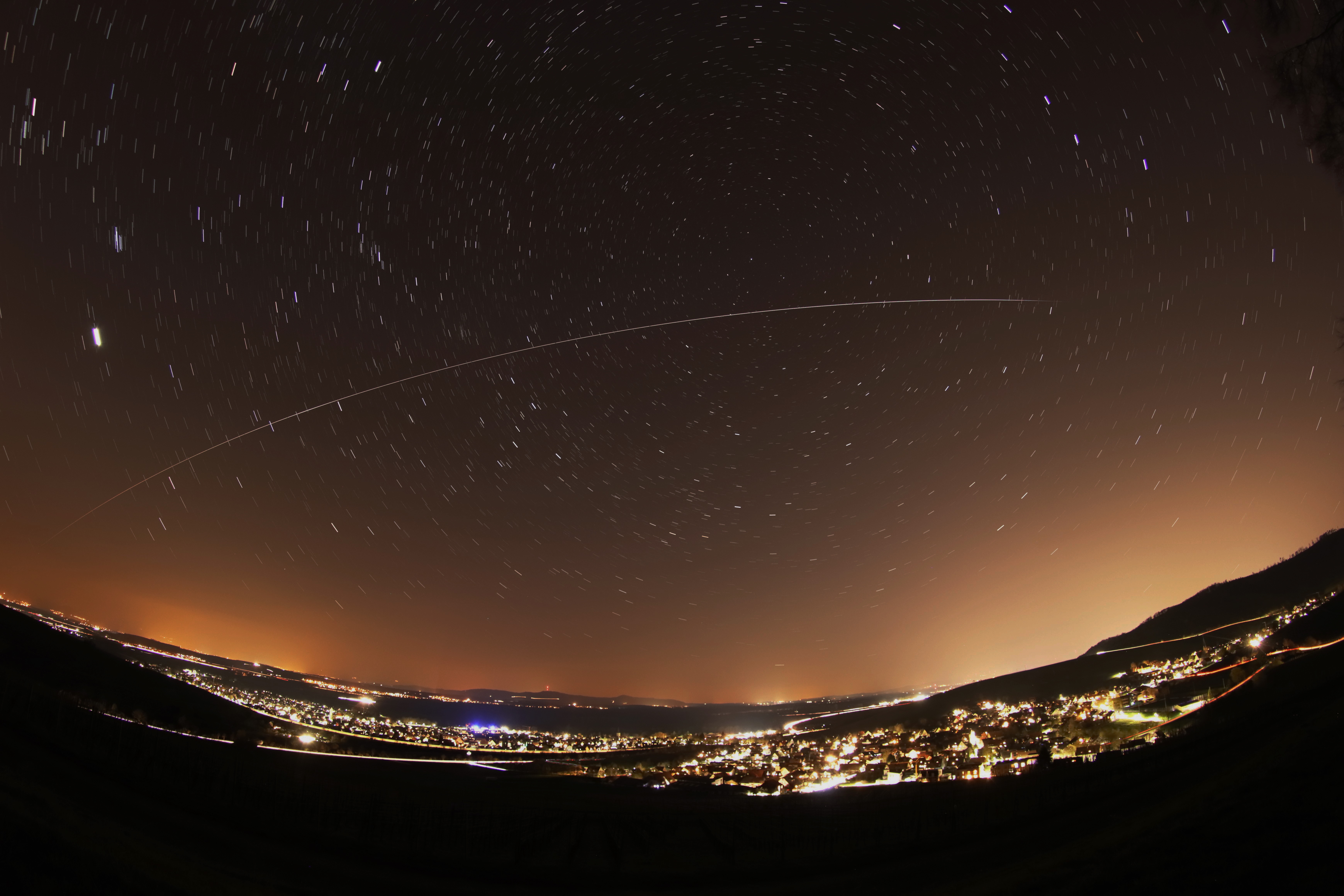 Die Aufnahme mit einem 8-mm-Fisheye-Objektiv zeigt die komplette Flugbahn der ISS über Ebringen bei Freiburg und dem Kaiserstuhl, der im Hintergrund liegt. Es wurden 19 Aufnahmen à 15 sec Belichtungszeit zischen 20:39 Uhr und 20:44 Uhr aufgenommen und mit Startrails überlagert.