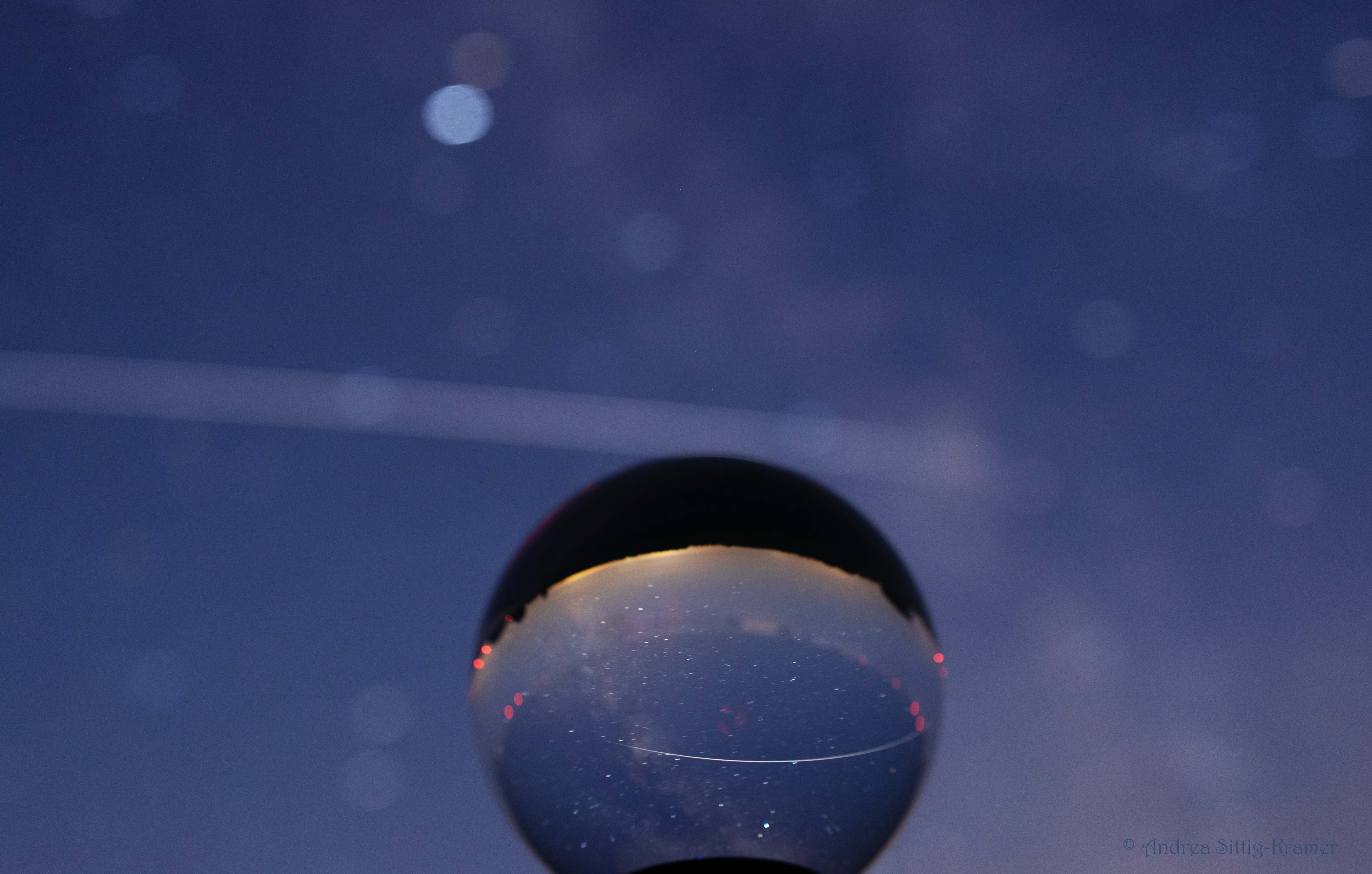 Die sternenklare, warme Sommernacht am 3./4. Juli 2025 nutzte ich für experimentelle Fotografie des nächtlichen Himmels mit meinem Lensball. Um kurz nach 1 Uhr sollte die ISS lange und hell im Sternbild Adler (Aql) zu sehen sein. Lensball und Kamera habe ich exakt so ausgerichtet, dass der Bereich unterhalb von Altair (Alpha Aql) möglichst im vollen Durchmesser des Lensballs positioniert ist. Alpha-, Beta- und Gamma-Aql sind auf meinem Bild am Himmel oben links als die drei hellen, unscharfen Lichtpunkte zu sehen. In der Glaskugel sind sie spiegelverkehrt unten rechts deutlich zu erkennen Zahlreiche Testbilder habe ich gemacht, bis alle Einstellungen gerade noch rechtzeitig fertig waren. Aber die Mühe hat sich gelohnt: Die Lichtspur des ISS-Überflugs ist genau im berechneten Himmelbereich und somit scharf in und verschwommen über meinem Lensball zu sehen. Die Sterne bilden kurze Strichspuren aufgrund der langen Belichtungszeit von 2 ½ Minuten. Erstaunt war ich bei der Bildauswertung, dass sogar das Band der Milchstraße auf der runden Glaslinse zu erkennen ist.