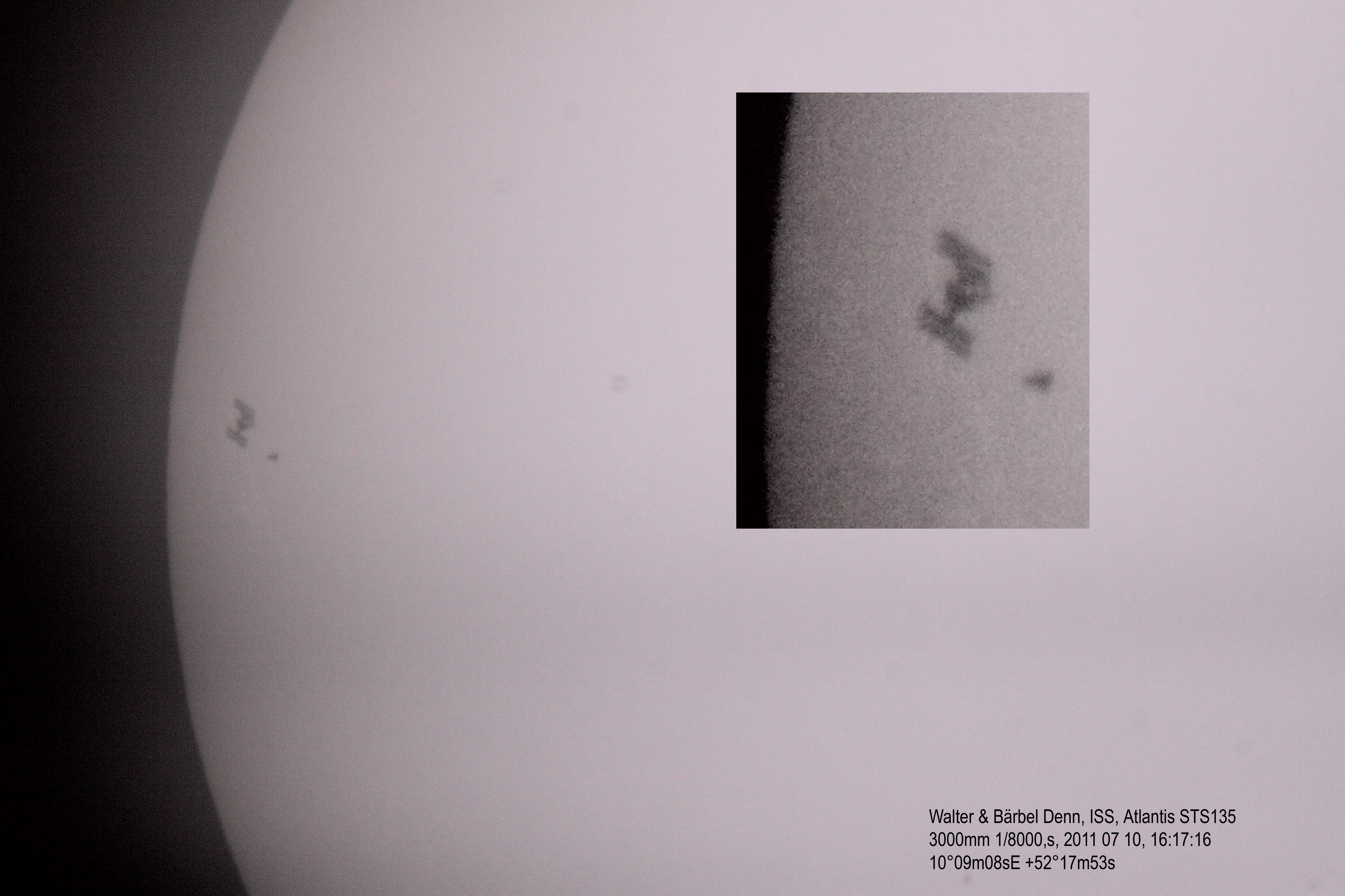 Dieses Bild zeigt die Atlantis zusammen mit der ISS knapp eine Stunde vor dem Andocken, es ist am 10. Juli 2011 in Rosenthal entstanden. Zu dieser Zeit war am Beobachtungsort leider eine hochnebelartige Bewölkung. Die ISS hat sich in nur 0,78 s über die Sonnenscheibe in Ziffernblattrichtung 10:25 bewegt, die Breite des Bodenpfades betrug 5,35 km. Das Raumschiff hatte um 16:17:16 Uhr MESZ einen Abstand zur Erde von 546 km. Die Beobachtungsdaten wurden mit Calsky berechnet.