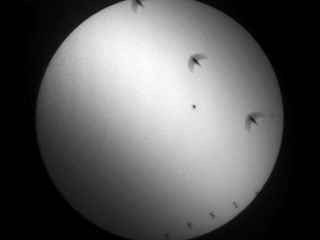 Am 17. Juni 2016 sollte es einen ISS-Transit vor der Sonne bei hohem Sonnenstand geben. Das Wetter war seit Wochen regnerisch, aber ich überwand meinen inneren Schweinehund und versuchte es. Und siehe da: Das Glück des Tüchtigen war mir hold! Das Bild ist eine Summe (eigentlich das Minimum) aus acht Einzelbildern. Der Vogel kam wenige Sekunden nach der ISS vorbei!