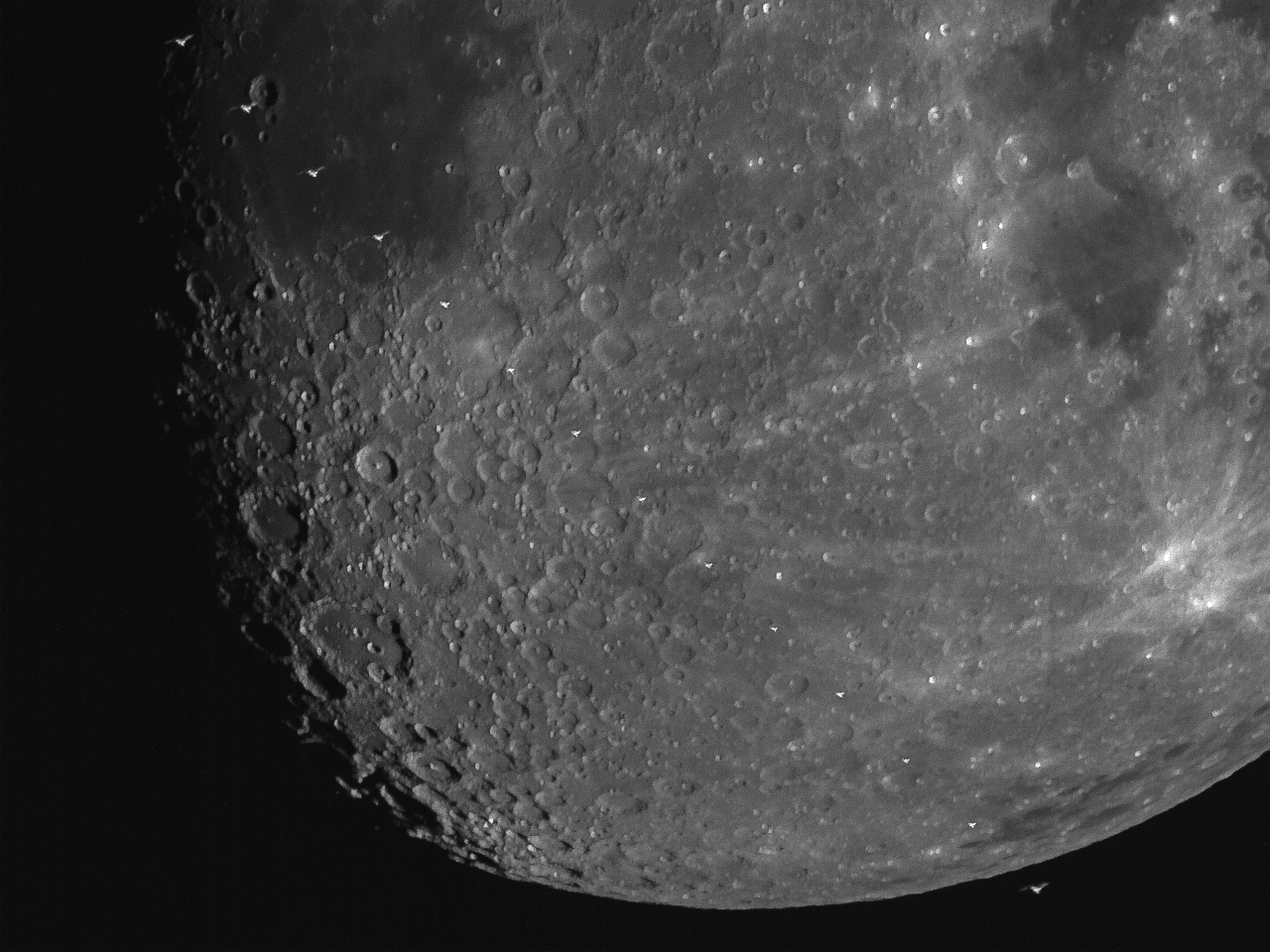 Auf die Sekunde genau, wie von CalSky versprochen, zog die Internationale Raumstation am Sonntagabend um 22:04:08 Uhr MESZ am zunehmenden Mond vorbei. Es war das erste Mal, dass ich diese Passage mit voll beleuchteter Raumstation vor dem Mond fotografieren konnte … mal was anderes. Die Entfernung war leider groß, 913 km, was dazu führte dass die ISS ziemlich winzig erscheint … und eher einer Taube ähnelt … aber einer sehr schnellen!