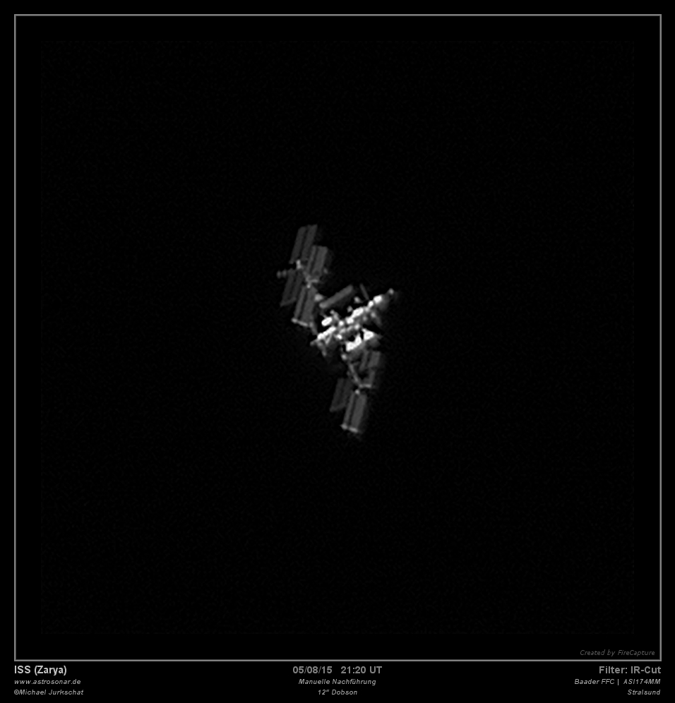 Am 5. August 2015 habe ich mal wieder den Dobson im Garten aufgebaut. Ziel war mal wieder die ISS am Nachthimmel aufzunehmen. Nach diversen Versuchen an den Abenden vorher, ist mir diesmal eine relativ gute Aufnahme gelungen. Gefilmt habe ich den kompletten Überflug, der Film zeigte einige interessante Stellen, wo die ISS sehr gut zu sehen war, wie zum Beispiel dieser Ausschnitt.