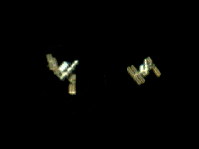 Als sich die ISS gerade aus Westen näherte ist das linke Bild entstanden. Als sie sich genau in Kulmination (also im höchsten Punkt) befand, entstand das rechte Bild. Man erkennt, dass sich ihre Ansicht deutlich verändert.